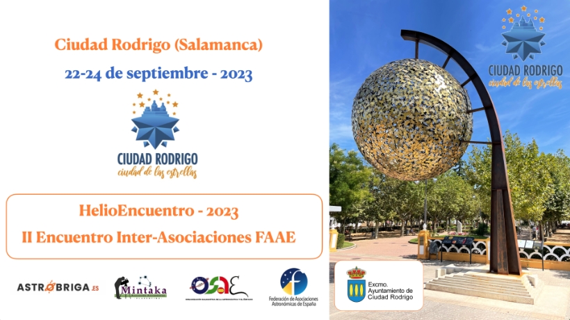 Del 22 al 24 de septiembre se celebrará en Ciudad Rodrigo el I Encuentro de Observadores Solares, Helioencuentro 2023, organizado por la Federación de Asociaciones Astronómicas de España a la que pertenece Astróbriga. La inscripción es gratuita, parta participar no es condición obligatoria pertenecer a ninguna asociación, y el límite es el 20 de septiembre. Puedes inscribirte aquí
