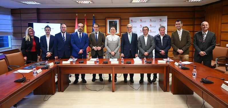 El presidente de la Diputación de Salamanca, Javier Iglesias, acompañado por el diputado de Economía y Hacienda, vicepresidente de Regtsa y alcalde de Ciudad Rodrigo, Marcos Iglesias, participó este lunes en la sede de la Consejería de Movilidad y Transformación Digital en Valladolid, en la presentación del proyecto europeo IBERUS, que se impulsará gracias a la colaboración interinstitucional de la Junta de Castilla y León, de las diputaciones de Salamanca y Valladolid, del Ayuntamiento de Ponferrada y de las Cámaras de Almeida, Sabugal, Figueira de Castelo Rodrigo, y Penacamor.