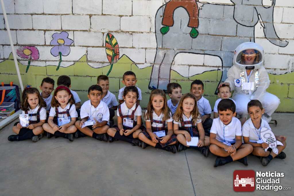 La matinal se desarrolló con una divertida bienvenida para los dos primeros ciclos en el antiguo «patio de arena» de Misioneras. Una bienvenida que se llevó a cabo bajo la temática de una aventura espacial, más teniendo en cuenta que el lema de este año es «viajamos juntos para llegar lejos». De esta forma, se realizó una presentación del nuevo alumnado, así como cada clase escribió una frase en una nave espacial relacionada con la temática, finalizando la actividad pintando con tiza en el suelo sus nombres.
