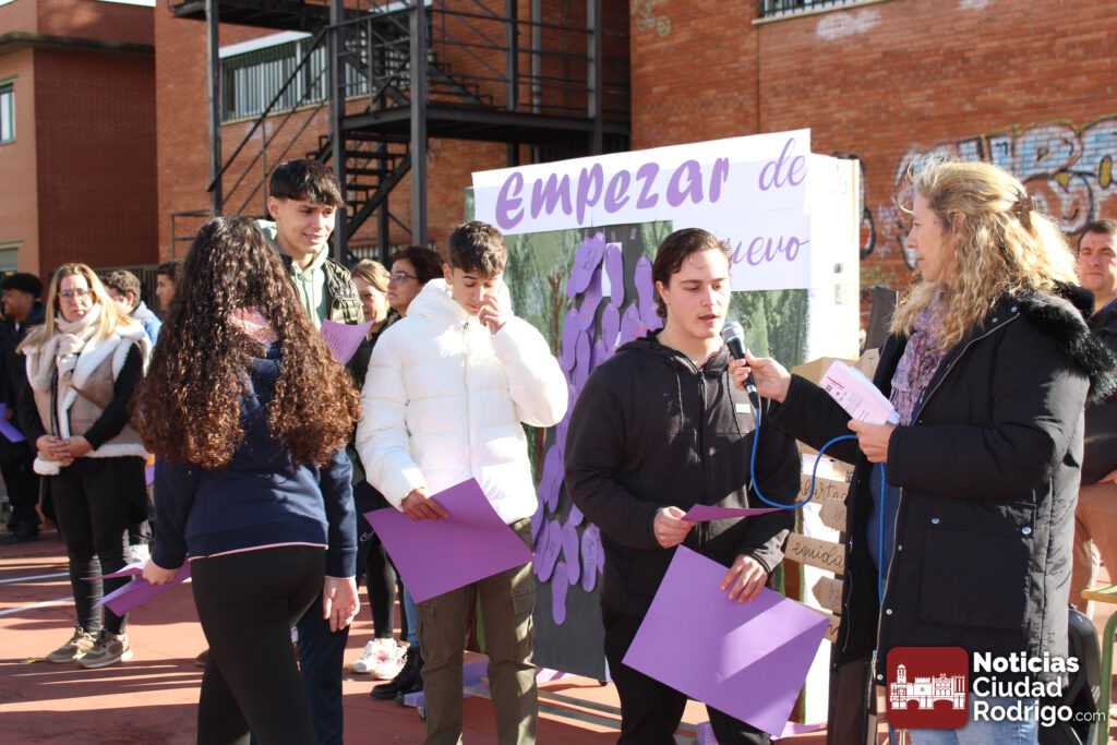 El acto ha comenzado en el patio a las 11 y media de la mañana. El director Jorge Rodríguez ha leído un manifiesto, donde ha calificado la violencia machista como «enemigo invisible que sólo se puede commbatir desde la educación. Seguidamente, los alumnos y alumnas de 1º de la ESO, coordinados por la orientadora Pepi Martín Choya, han leído los nombres de las 55 mujeres que hasta ayer habían fallecido a manos de sus parejas y el de los 10 menores asesinados por el padre como una forma de hacer daño a la madre. Los nombres estaban escritos en huellas que se iban pegando en un panel. Después, cada curso ha leído mensajes que empezaban con el lema de este año.