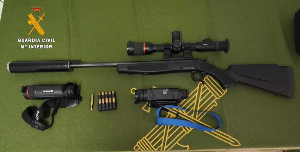 Los guardias civiles descubrieron en el interior del vehículo un rifle de caza, el cual llevaba acoplado un silenciador, así como una mira telescópica, además de dos visores térmicos, varios cartuchos, un hacha y una linterna.