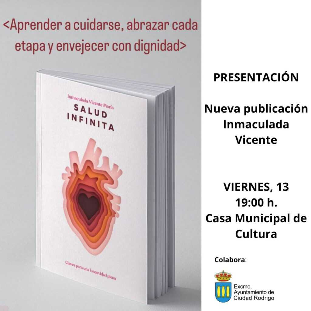 El viernes, día 13, llega el turno de la mirobrigense Inmaculada Vicente María y su «Salud Infinita. Aprender a cuidarse, abrazar cada etapa y envejecer con dignidad» que se presentará a las 19:00 horas.