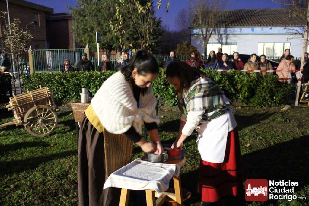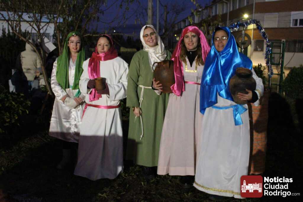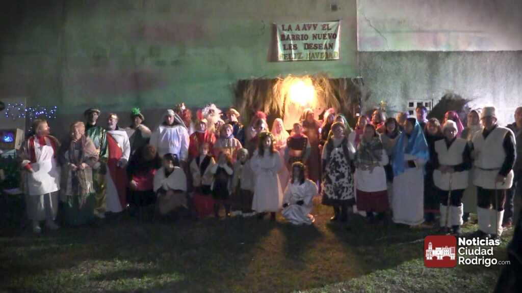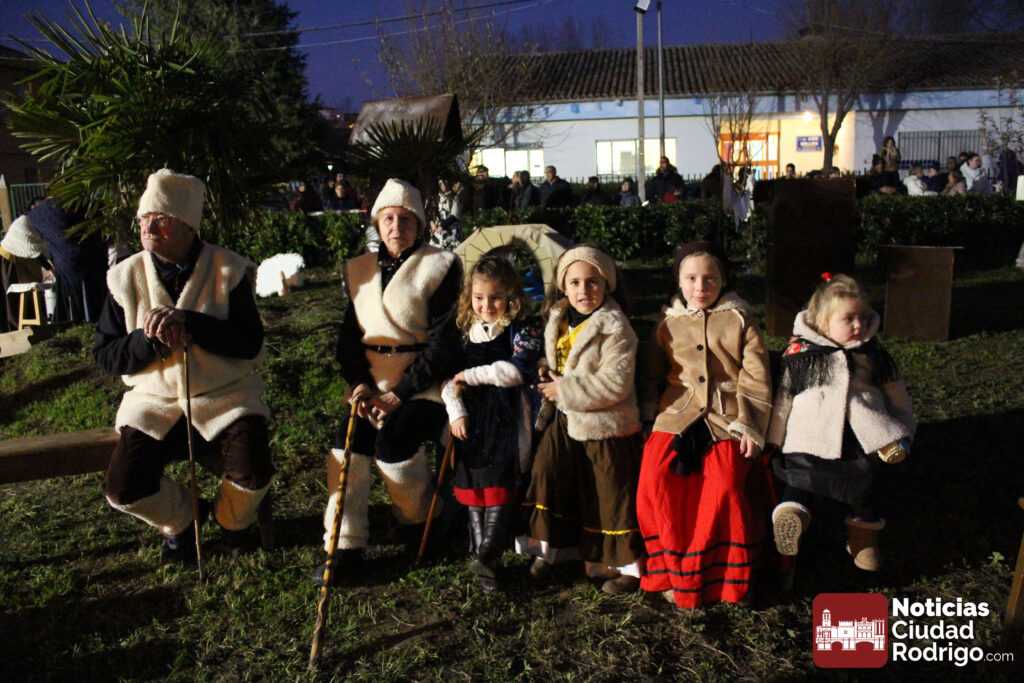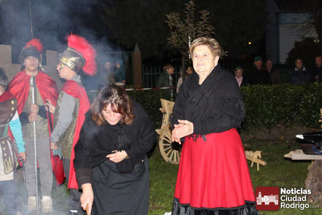El Belén Viviente del Barrio Nuevo se ha celebrado hoy en el espacio verde ubicado delante del colegio El Puente, en la calle Eras. Allí, la asociación de vecinos ha instalado un buen número de pequeños espacios que han recreado oficios y tareas tradicionales desde la hoguera de los pastores hasta el portal, pasando por el puente sobre el río, las aguaderas con su pozo incorporado, un puesto de fruta, las panaderas, las queseras y una lumbre donde han cocinado caldo y patatas meneás.
