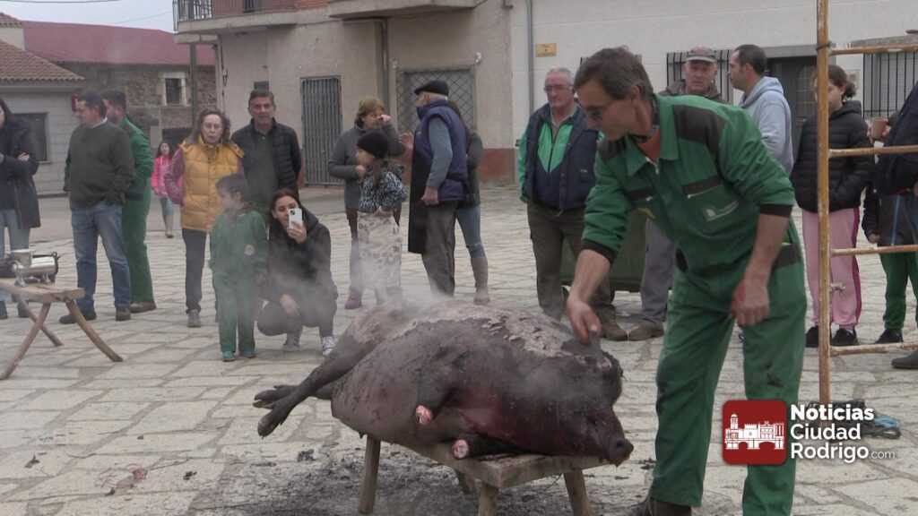 El rito de la matanza requería participación, casi fiesta familiar y a veces vecinal; algarabía mondonguera, en fin, que servía a los chiquillos para divertirse, a veces valía de excusa para librarse de la escuela, eso sí, a cambio de una exhaustiva lección de anatomía, puesto que de todos es sabido el parecido de este animal con los humanos. Los mayores trabajaban, sí, pero en torno al buen aguardiente, perrunillas, festines culinarios y cuchipandas varias. Hielos, fríos y nieblas se mezclaban con los gruñidos matinales del gorrino; y el olor a paja de centeno y pelo chamuscado recorría las calles del pueblo la mayoría de las mañanas del invierno. Sangre porcina mezclada con agua se detenía en las pequeñas pozas de las regateras haciendo una espuma mitad rito ancestral y condumio necesario. Primaba lo artesanal sobre lo artificioso, lo económico sobre lo estético; pero también lo festivo y lúdico en comunión con lo ceremonioso de la muerte del cerdo.