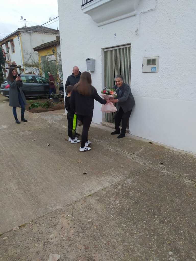 Los niños del pueblo han sido los encargados en darle los regalos, acompañada de sus familiares y vecinos.