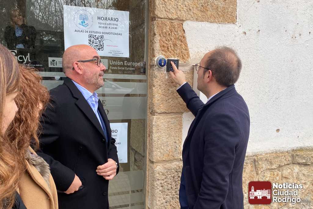 Representación del Equipo de Gobierno del Ayuntamiento de Ciudad Rodrigo, encabezada por el Alcalde mirobrigense Marcos Iglesias, presentaron la nueva Sala de Estudio domotizada. Un espacio que funcionará de forma similar a las instalaciones deportivas domotizadas, es decir, mediante reserva a través de la app AVISA Ciudad Rodrigo, pudiendo acceder también por el QR que aparece en la entrada del edificio, ya disponible.