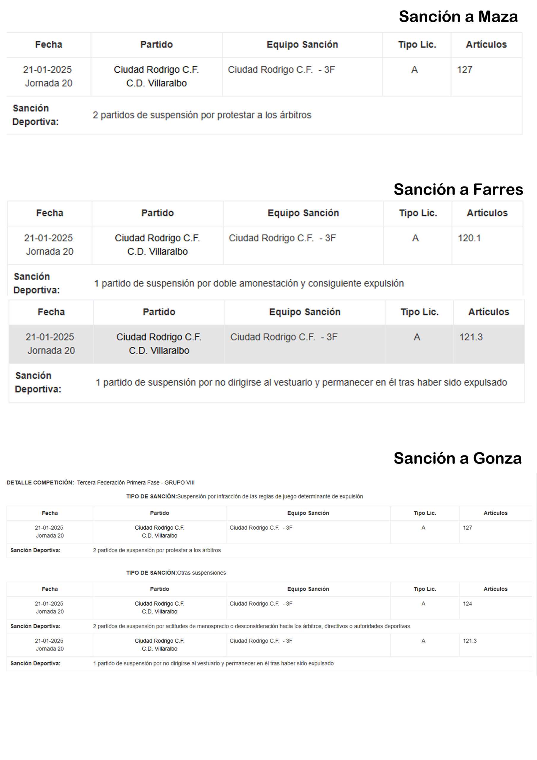 Alberto Maza y Farres han sido sancionados con 2 partidos, mientras que Gonza estará 5 partidos de «castigo»