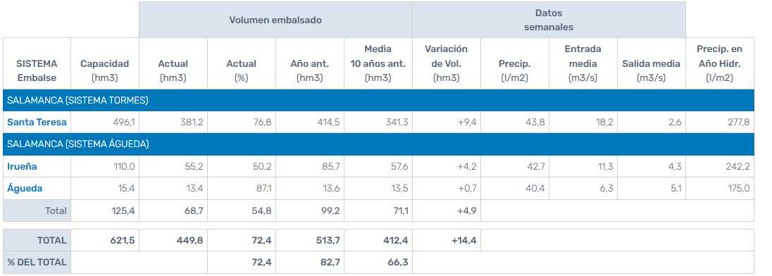 Todo ello nos lleva a preguntarnos por el nivel actual de los pantanos de la comarca. Irueña se encuentra al 50 % de su capacidad y el Águeda al 87 %. Con respecto al año pasado en esta fecha, el pantano del Águeda está más o menos al mismo nivel, mientras que el de Irueña se encuentra por debajo de las cifras alcanzadas el año pasado tal y como muestra la siguiente tabla (CHD):