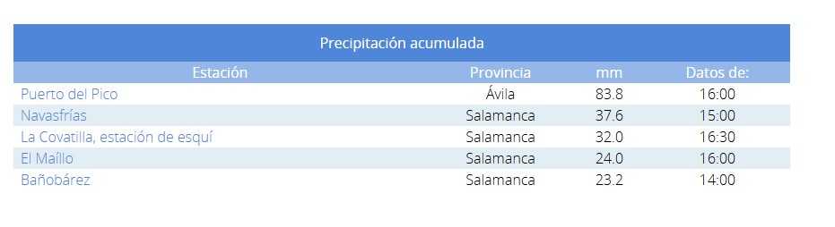 La AEMET señala cuatro localizaciones salmantinas como las localidades donde más ha llovido en las últimas 24 horas: Navasfrías, La Covatilla, El Maíllo y Bañobárez. En Navasfrías, se han acumulado casi 38 mm en las últimas 24 horas. En El Maíllo, además de llover, se han registrado rachas de viento de hasta 80 kilómetros hora sobre las cuatro de la madrugada. En El Bodón, se han registrado 20,8 mm. de precipitación acumulada.