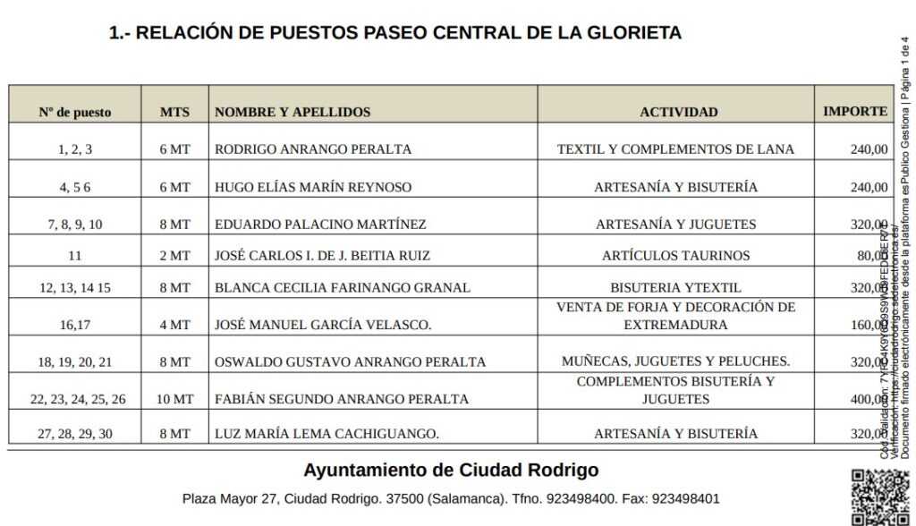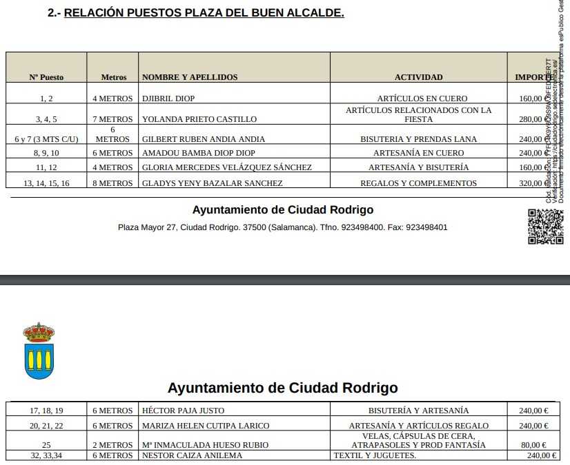 El Ayuntamiento de Ciudad Rodrigo ha resuelto la relación de puestos de venta ambulante de cara al Carnaval del Toro 2025. Esta relación, realizada mediante solicitud de los comerciantes durante el pasado mes de enero, ha dejado como resultado 53 puestos en total entre las zonas de la Plaza del Conde, Plaza del Buen Alcalde y Parque de La Glorieta, ocupando estos 164 de los 191 espacios disponibles.