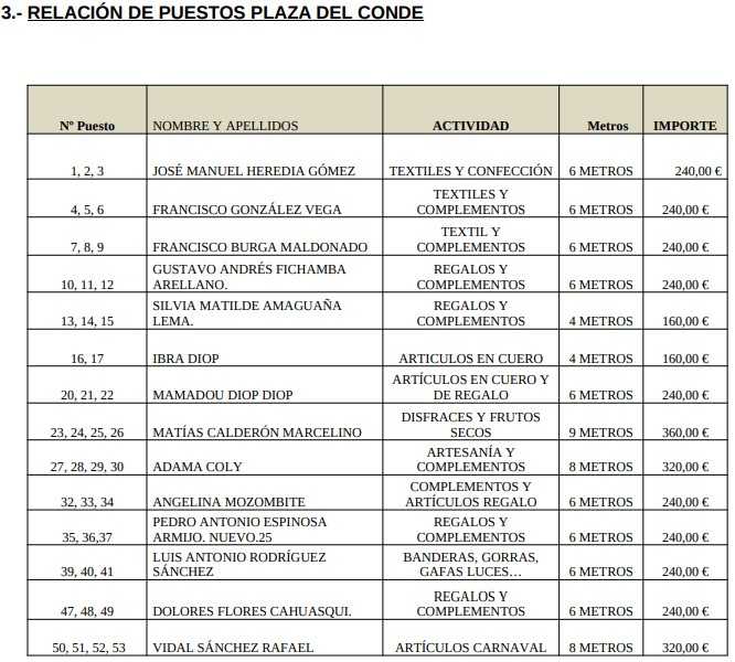 En la distribución de los puestos, la zona más demandada ha sido el Parque de La Glorieta, que ha registrado 29 puestos, ocupando estos los 94 espacios disponibles en dicha zona (2024: 27 puestos y 84/94 espacios). En la Plaza del Conde serán 14 puestos, ocupándose 45/57 espacios (2024: 16 puestos y 47/57 espacios); mientras que en la Plaza del Buen Alcalde habrán 10 puestos, cubriéndose 26/40 espacios (2024: 13 puestos y 37/42 espacios).