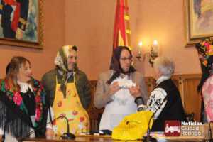 Además de la entrega del bastón de mando siempre hay bromas a los concejales varones. En esta ocasión vestirles con mandil y pañuelo y, de regalo, una bolsa de paciencias. A la concejal de Igualdad, unas rosquillas de Ledesma.