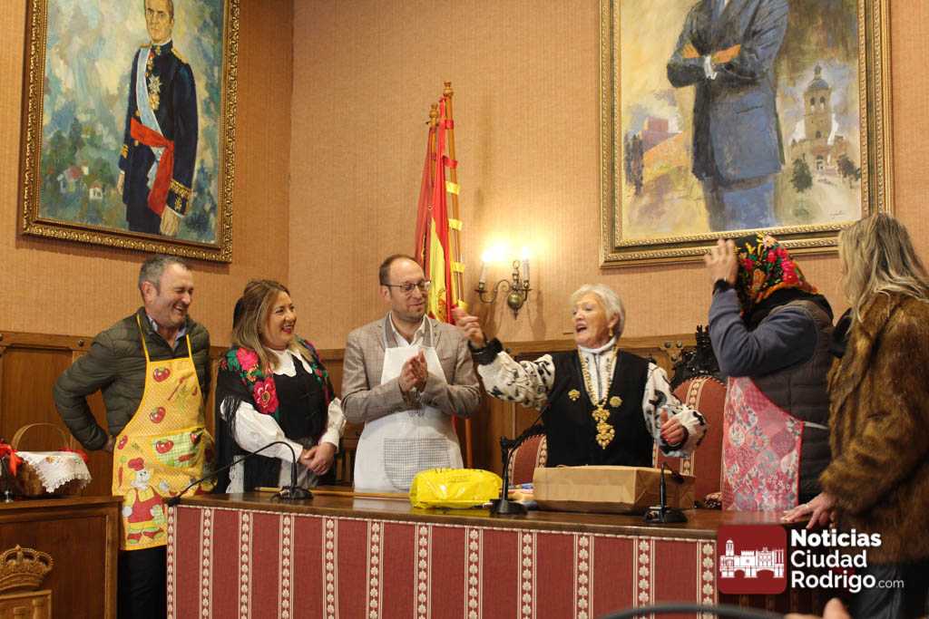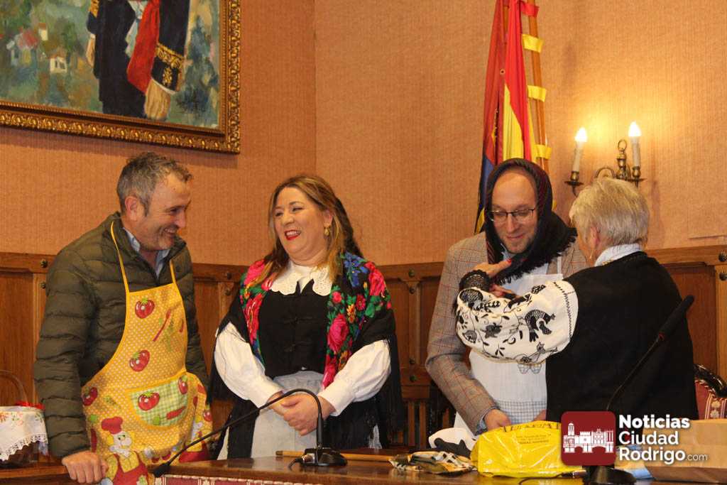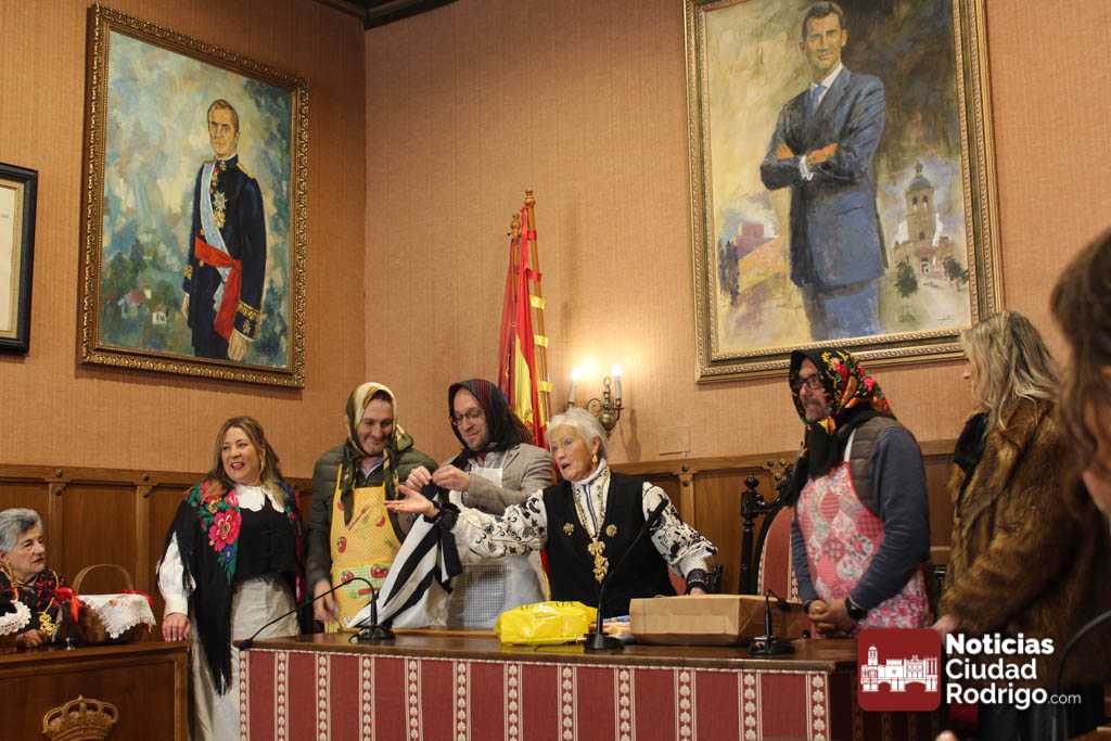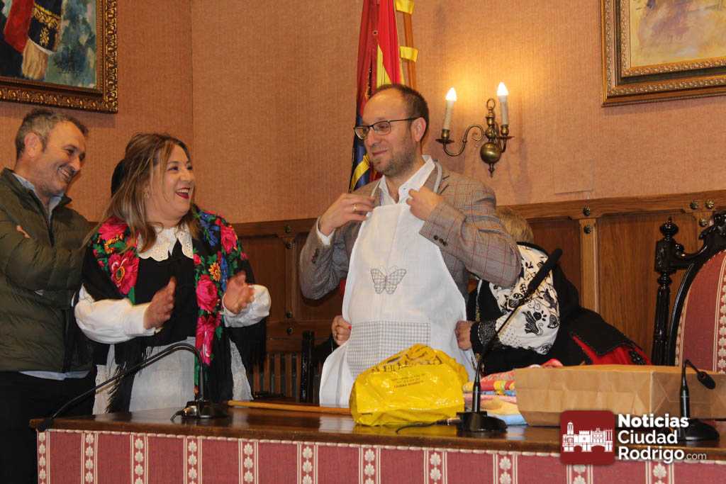 Además de la entrega del bastón de mando siempre hay bromas a los concejales varones. En esta ocasión vestirles con mandil y pañuelo y, de regalo, una bolsa de paciencias. A la concejal de Igualdad, unas rosquillas de Ledesma.