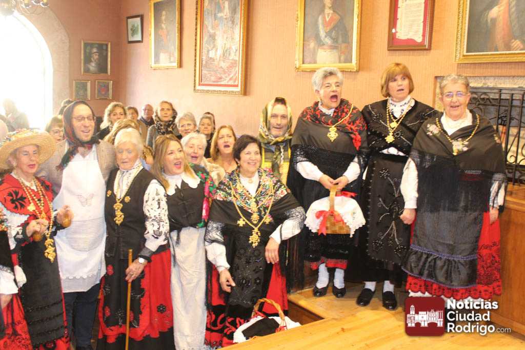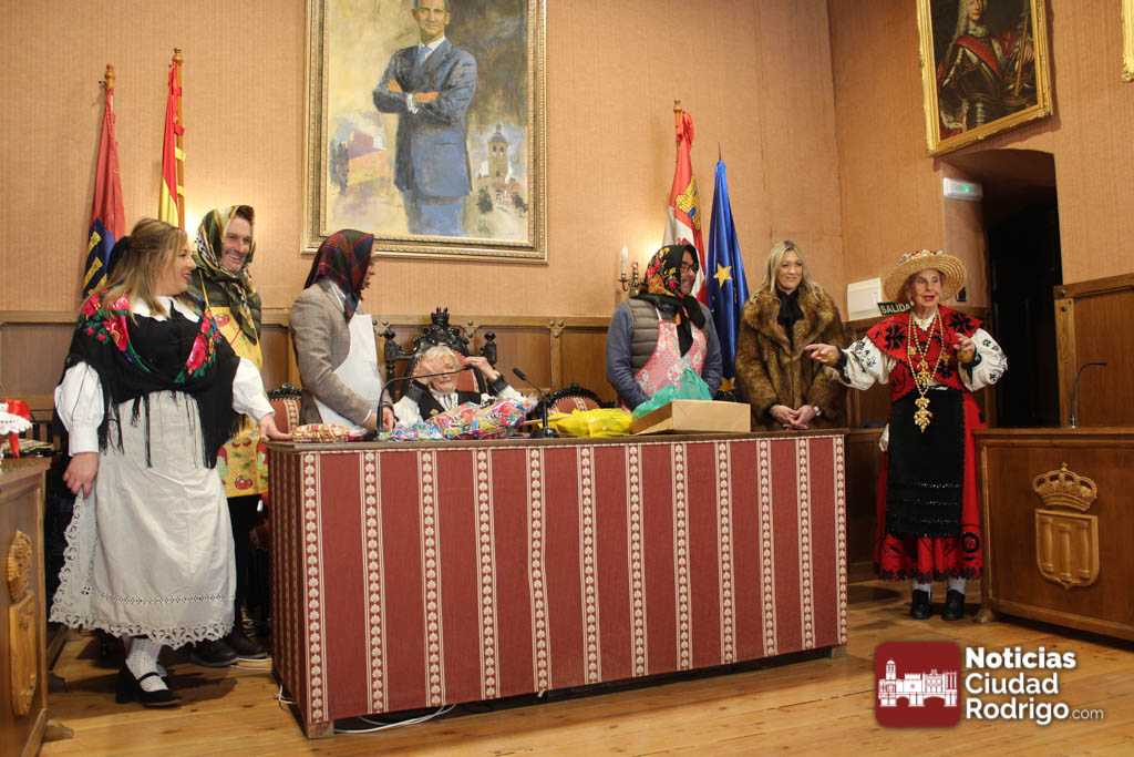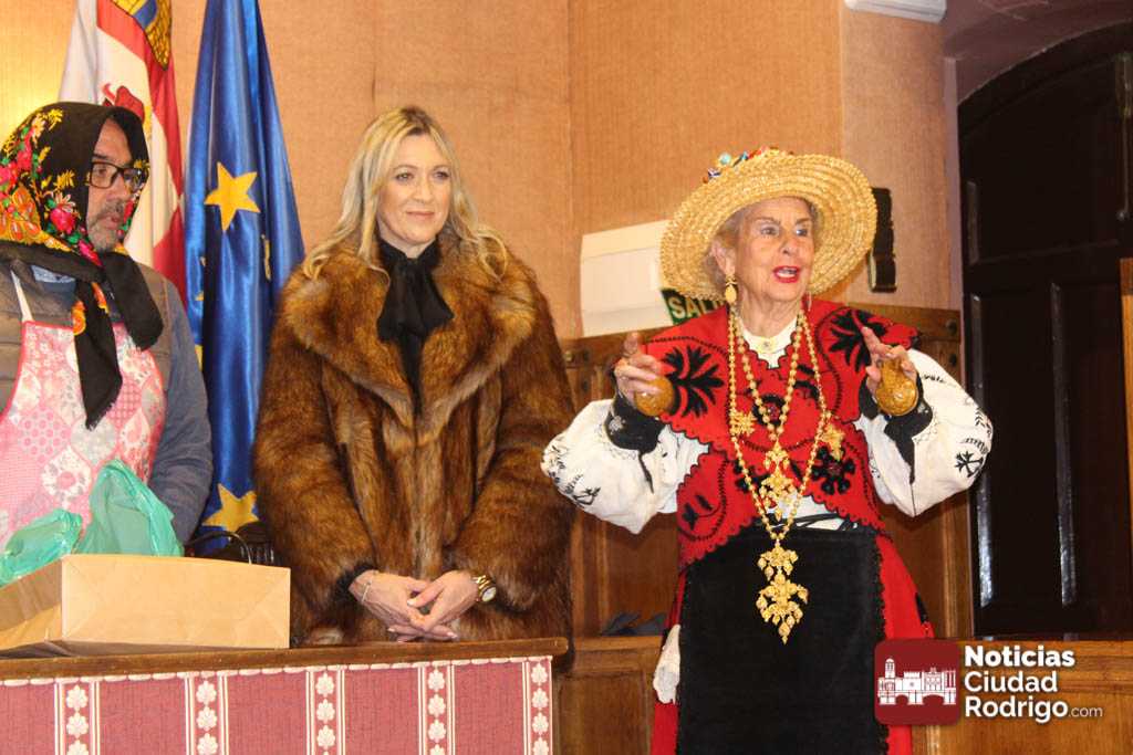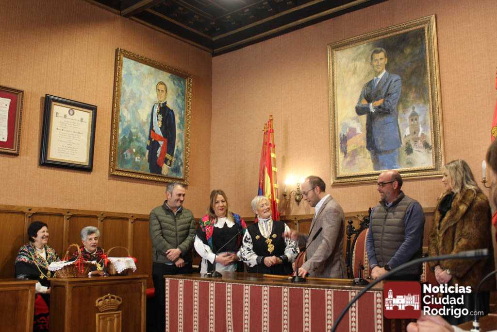 Rosario Pérez es una de las mujeres del Mercado de Abastos que recuperaron la tradición de Las Águedas en Ciudad Rodrigo. De ellas sólo quedan tres (Rosario, Fina y Nieves) a las que ahora se unen las mujeres del grupo Amanecer. En un día como hoy 5 de febrero, festividad de San Águeda, acuden al salón de plenos del Ayuntamiento de Ciudad Rodrigo a por el bastón de mando. Rosario, La Olaya, siembre lo recoge desde hace 33 años (año 92). Cuatro alcaldes le han entregado este bastón: Dionisio Holgado, Javier Iglesias, Juan Tomás Muñoz y Marcos Iglesias.