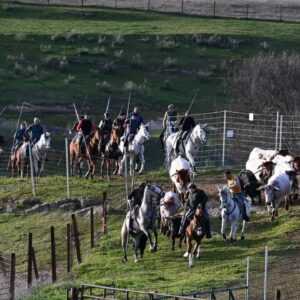 El encierro de los seis toros de Guadajira que protagonizarán el encierro con caballos del Domingo de Carnaval va tomando forma junto a los bueyes en la dehesa de Casasola. El alcalde, Marcos Iglesias, junto al presidente de la Comisión Taurina, Ramón Sastre, y otros ediles del equipo de gobierno han seguido el trabajo que está realizando Juan Luis Montero «Perita» y su equipo de caballistas.