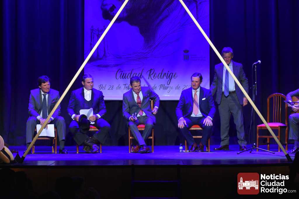 La presentación corrió a cargo de la voz y la guitarra del músico Eduardo Palencia, que estuvo tocando de fondo durante las intervenciones de los cinco pregoneros: Antonio, Julio, Ignacio, Jaime y Pablo de la Puerta García Corona. El primero en hablar fue Julio de la Puerta que ofreció agradecimiento a todos los presentes, a su familia y a la peña El Caballo, de manera especial a Manuel Montero que fundó esta peña de El Caballo. En primer lugar, habló de los orígenes de la ganadería de la Puerta García Corona, haciendo referencia a su padre Julio de la Puerta que le enseñó que «ser ganadero es vivir cada día con la certeza de que la naturaleza no da nada a cambio de nada» y «que sólo con humildad y esfuerzo se puede llegar lejos en este mundo tan exigente». También mencionó a su madre, María Pepa que siempre le acompañó «con talento y fortaleza». Se refirió al toro de lidia y a la figura del caballo. «No sólo hemos heredado una ganadería sino una filosofía de vida, con el compromiso de seguir trabajando con la misma humildad y entrega». También, se refirió a sus experiencias como garrochista en las ocasiones que ha estado en Ciudad Rodrigo. Y terminó su intervención hablando de los encierros.