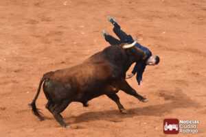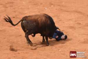 Herida por asta de toro en glúteo izquierdo de dos trayectorias, una ascendente de 20 centímetros que atraviesa y dislacera glúteo mayor y menor, y otra hacia línea media de 15 centímetros que dislacera glúteo mayor y fascia glúteo menor. No afectación nerviosa ni vascular. No hemorragia importante. Aplastamiento brazo derecho con erosiones amplias, sin síndrome compartimental ni aparente lesión ósea ni articular. Erosión en scalp sin hemorragia. Pronóstico: grave.