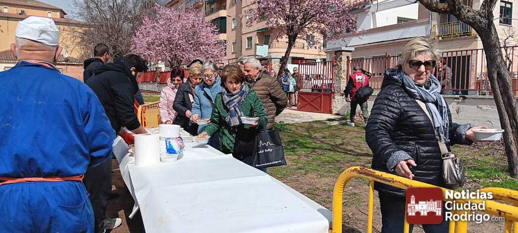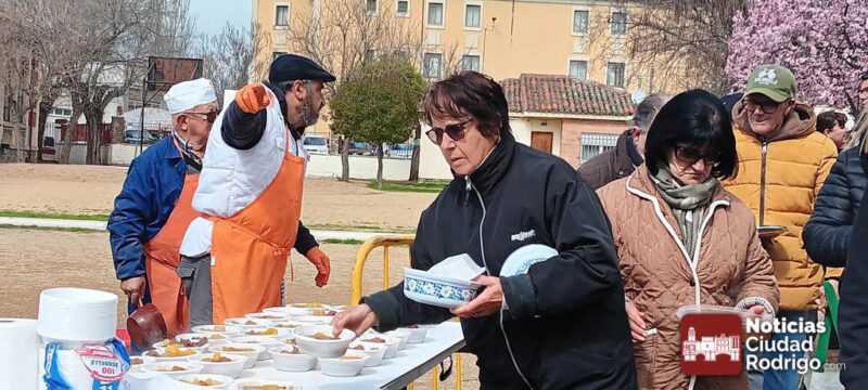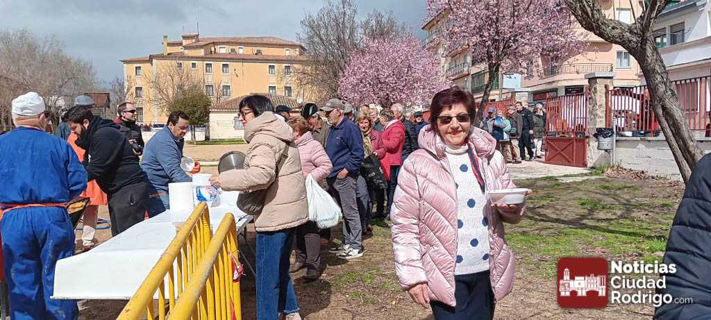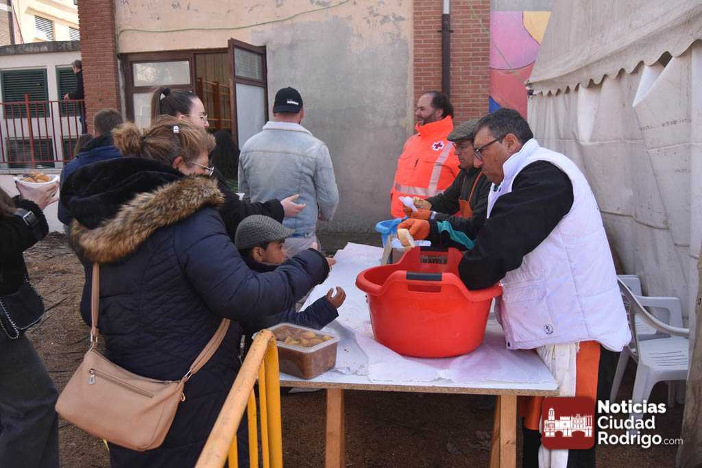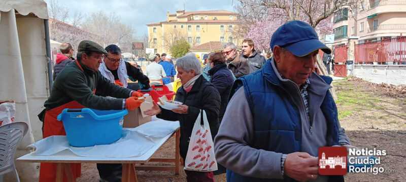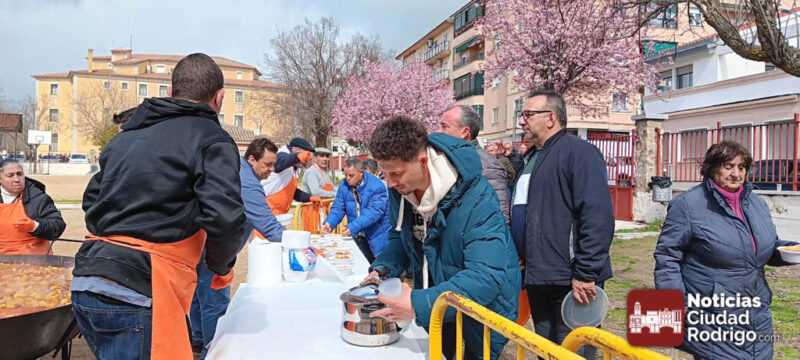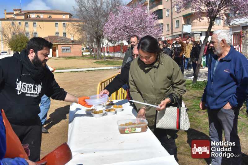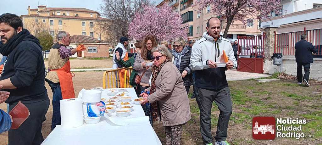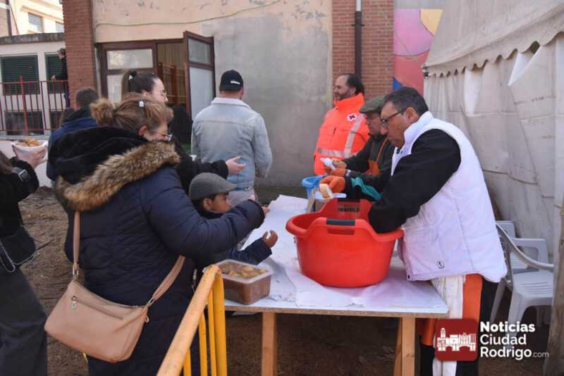 La comida ha comenzado a repartirse pasadas las dos y cuarto de la tarde, para entonces la cola de personas a la espera de la carne con patatas era muy grande, desde la puerta del patio del colegio San Francisco, donde se repartían, hasta dar la vuelta por la calle Escuelas. Muchos han optado por comerlas en las mesas y sillas preparadas en el pabellón deportivo del paseo de las Madroñeras y otros han elegido traer cazuelas o recipientes para llevarlas a casa.