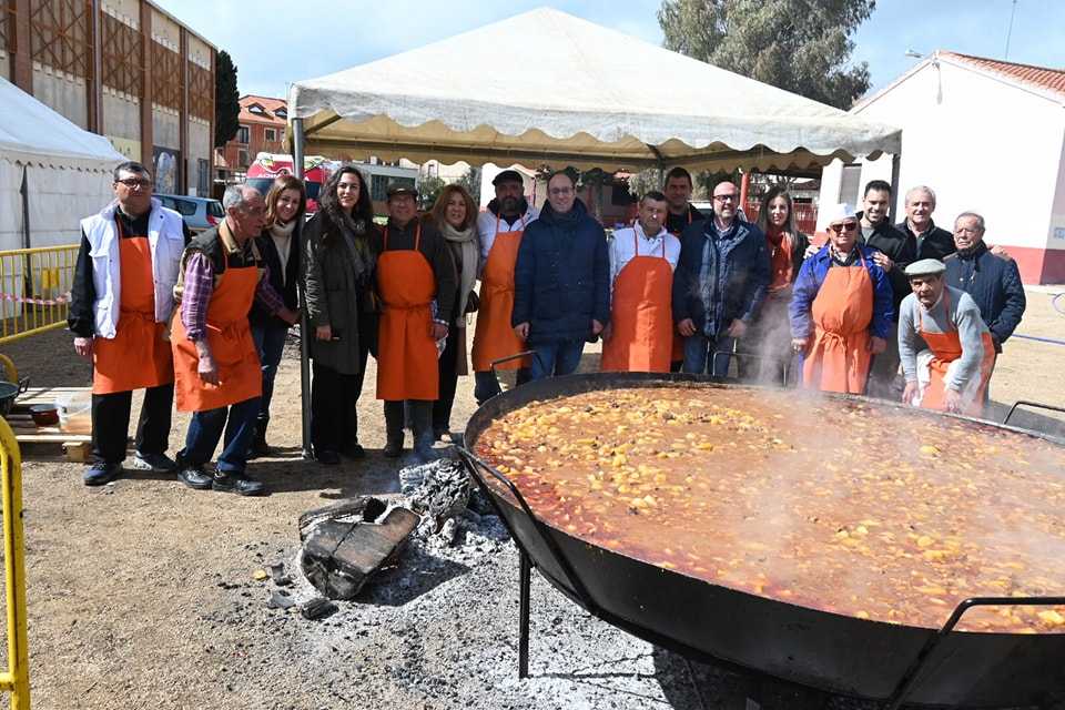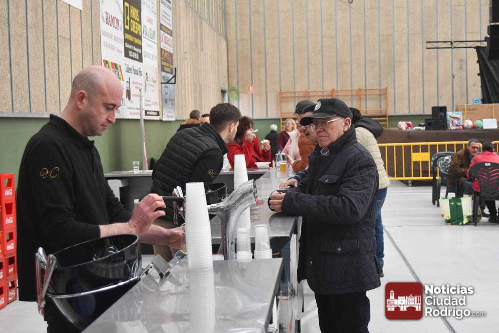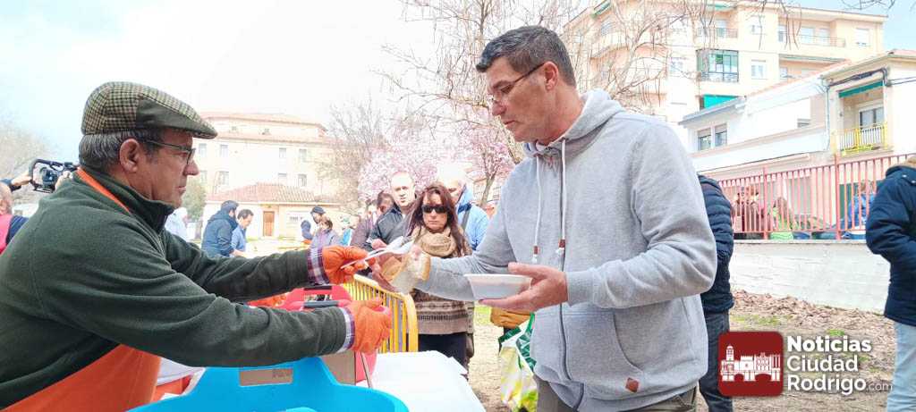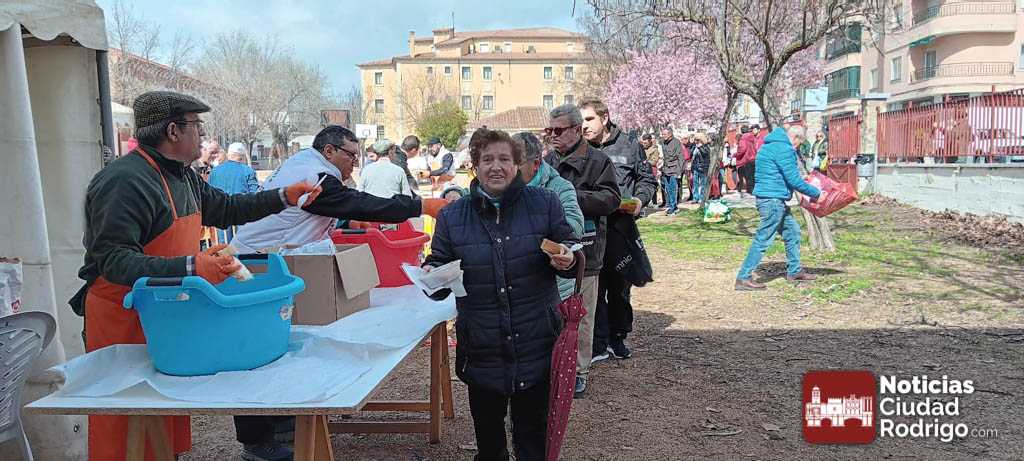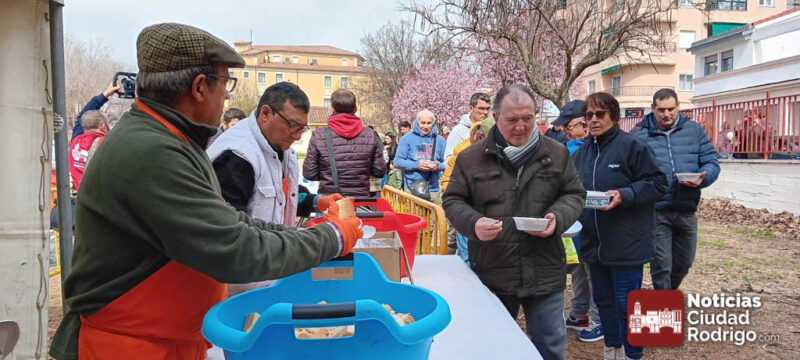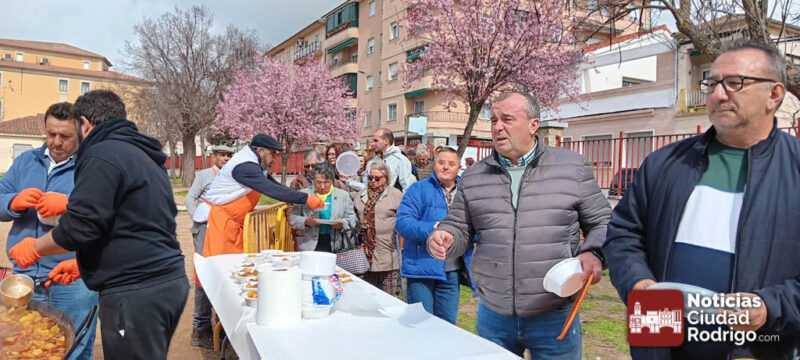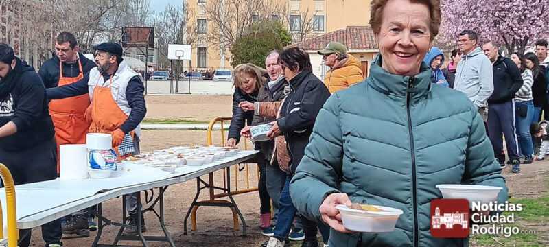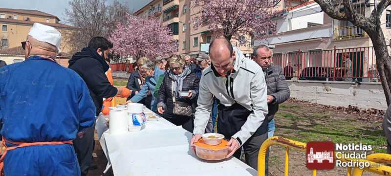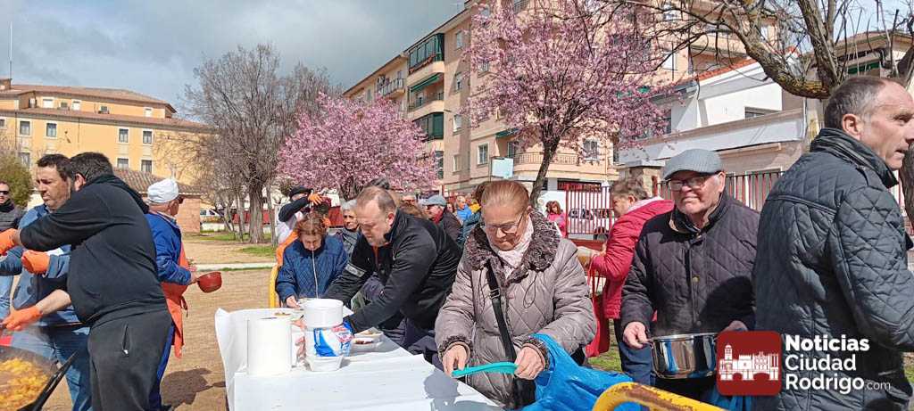 La comida ha comenzado a repartirse pasadas las dos y cuarto de la tarde, para entonces la cola de personas a la espera de la carne con patatas era muy grande, desde la puerta del patio del colegio San Francisco, donde se repartían, hasta dar la vuelta por la calle Escuelas. Muchos han optado por comerlas en las mesas y sillas preparadas en el pabellón deportivo del paseo de las Madroñeras y otros han elegido traer cazuelas o recipientes para llevarlas a casa.