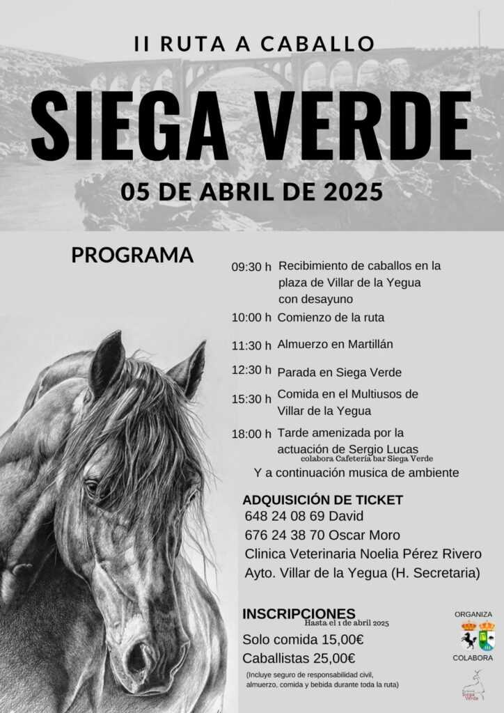 La II Ruta a caballo «Siega Verde», organizada por los Ayuntamientos de Villar de la Yegua y Villar de Argañán con la colaboración con la Fundación Siega Verde, tendrá lugar el sábado 5 de abril.