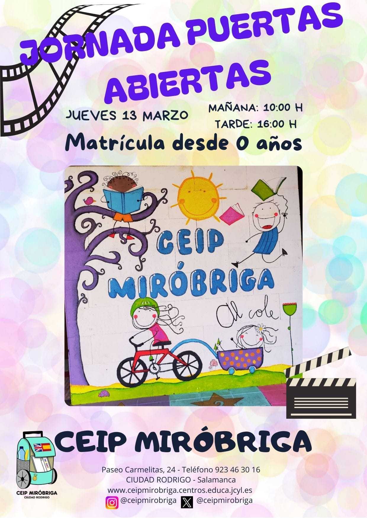El CEIP «Miróbriga» de Ciudad Rodrigo celebra mañana jueves 13 de marzo una Jornada de Puertas Abiertas, dirigidas a padres y madres de niños y niñas a partir de 0 años.