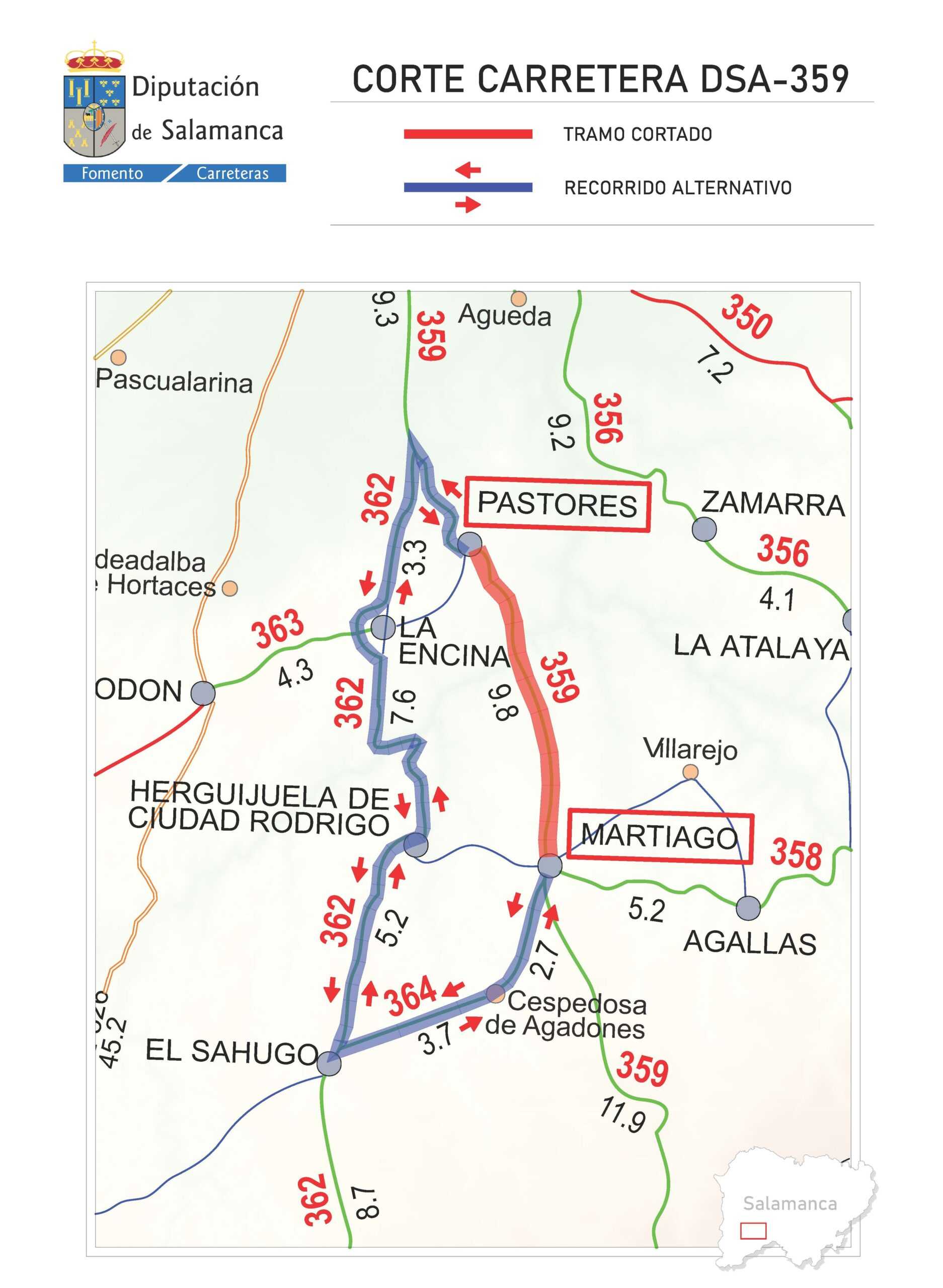 Para los desplazamientos entre ambos puntos se recomienda el itinerario alternativo a través de los municipios de La Encina, Herguijuela de Ciudad Rodrigo, El Sahugo y Cespedosa de Agadones.