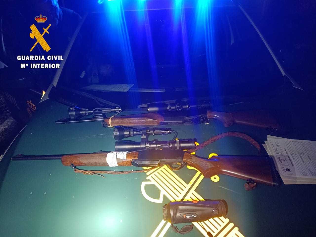 Al proceder a la identificación de los sospechosos, los guardias civiles localizaron en el vehículo dos rifles con miras telescópicas y sistemas de iluminación acoplados, uno de ellos municionado, además de munición para ambas armas.