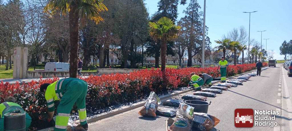 Cortes puntuales y desvío del tráfico esta mañana en la avenida de España con motivo de la intervención en el jardín de la mediana, donde están plantadas las palmeras. Se ha repartido una capa de corteza con la finalidad de que no crezcan hierbas. Esta intervención ha sido realizada desde la delegación de Jardines, Parques y Alamedas del Ayuntamiento de Ciudad Rodrigo.