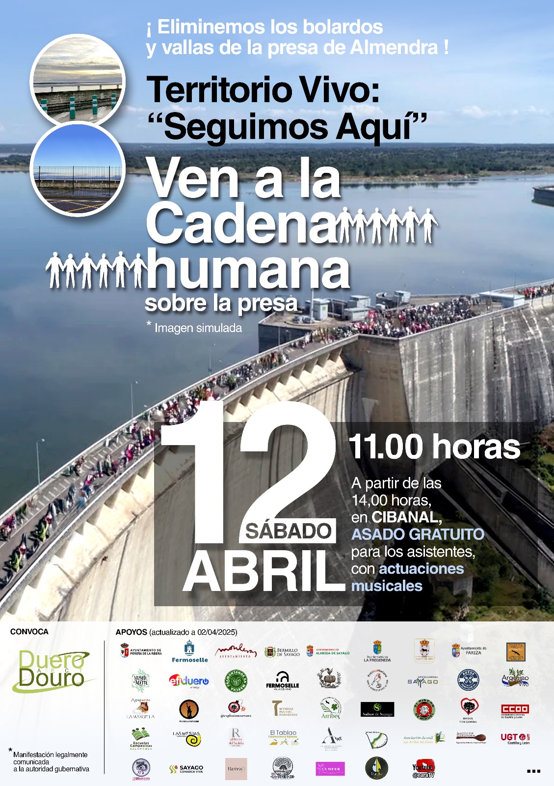 La Cadena Humana comenzará a formarse a las 11.00 horas del sábado 12 de abril en el muro de la presa de Almendra. En torno a las 13:00 horas, la periodista de reconocido prestigio Mª José Pintor procederá a la lectura del manifiesto. Y finalmente, a partir de las 14:00 hora, en Cibanal, se ofrecerá a los asistentes un asado gratuito amenizado con actuaciones musicales como muestra de agradecimiento.