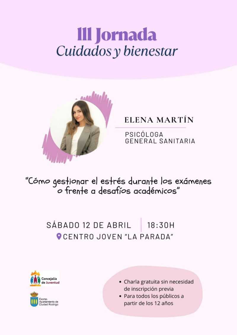 La psicóloga Elena Martín ofrecerá una charla sobre «Cómo gestionar el estrés durante los exámenes o frente a desafíos académicos en el centro joven «La Parada» el día 12 de abril a las seis y media de la tarde. Para todos los públicos a partir de los doce años de edad. Sin necesidad de inscripción previa y de forma gratuita. Charla organizada por la concejalía de Juventud del Ayuntamiento de Ciudad Rodrigo. Se incluye dentro de la III Jornada de Cuidados y Bienestar, organizada por esta concejalía.