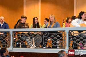 Comenzó con la cofradía Jesús Amigo de los Niños, «una cofradía llena de vida, de niños y alegría», relacionándolo con el sacramento del Bautismo, por el que «somos abrazados por Dios». En el escenario salía un cofrade con la vestimenta de la cofradía correspondiente mientras sonaba el testimonio relacionado con ella.