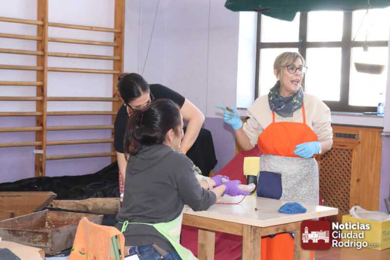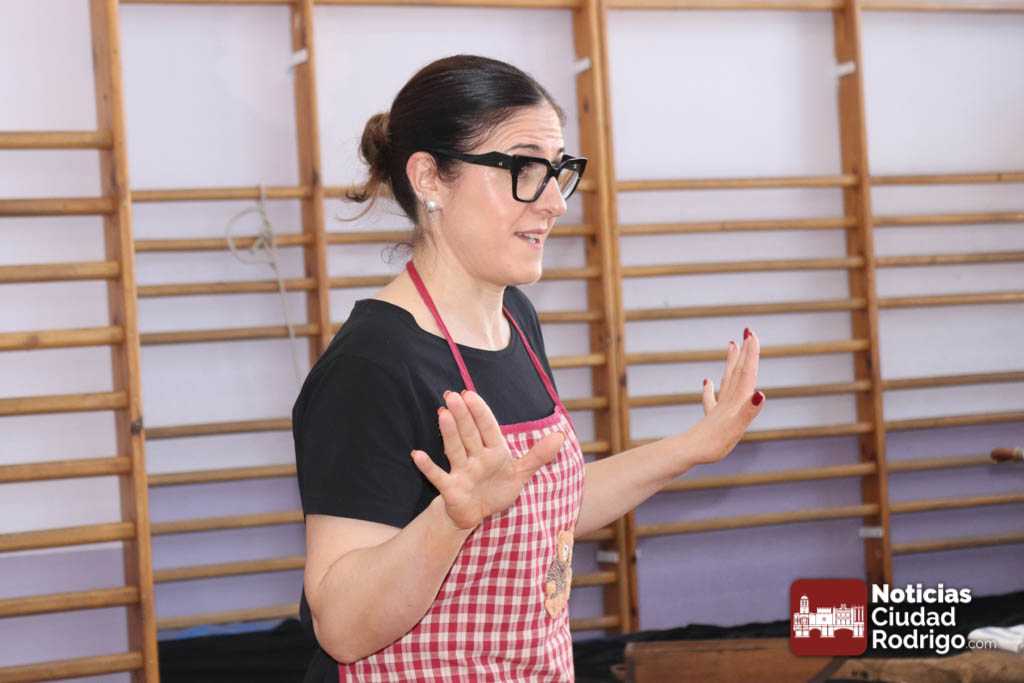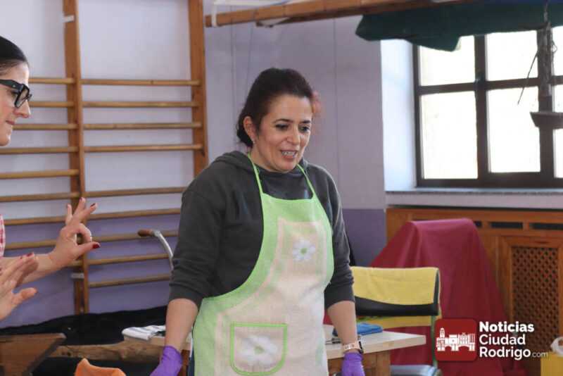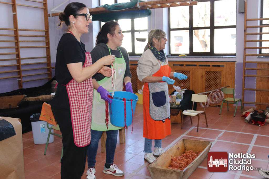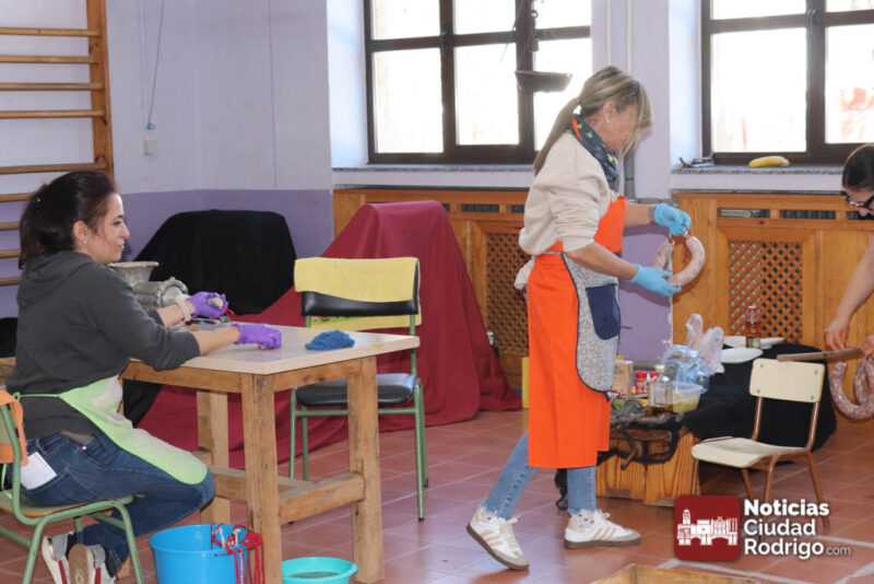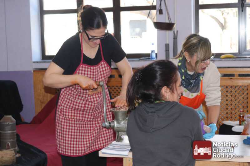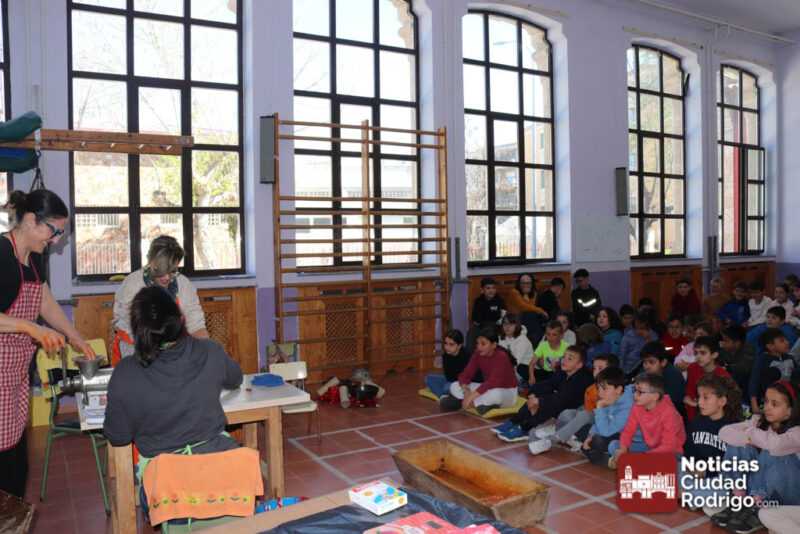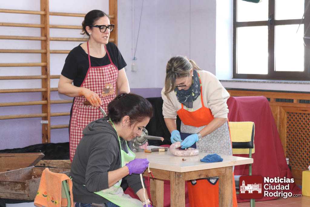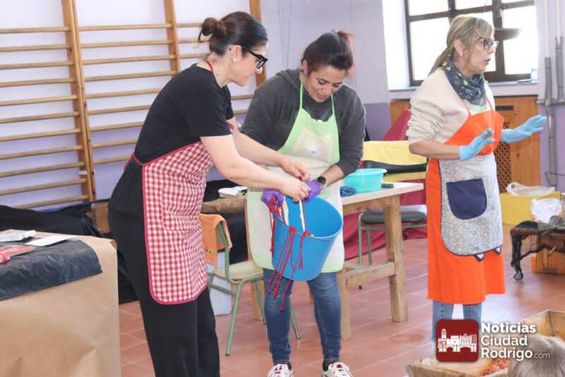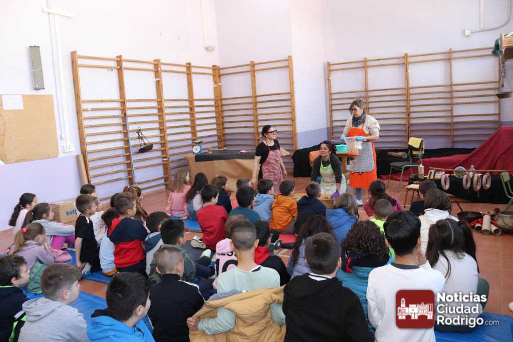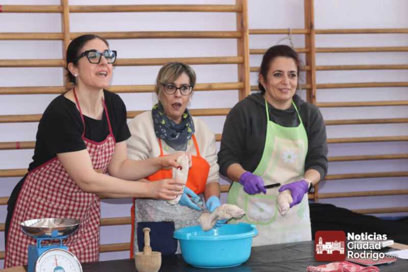 Las profesoras Raquel, Marta y Begoña, del colegio San Francisco de Ciudad Rodrigo, han sido las encargadas de acercar las labores de la matanza tradicional a los niños y niñas del colegio San Francisco durante la mañana de hoy.