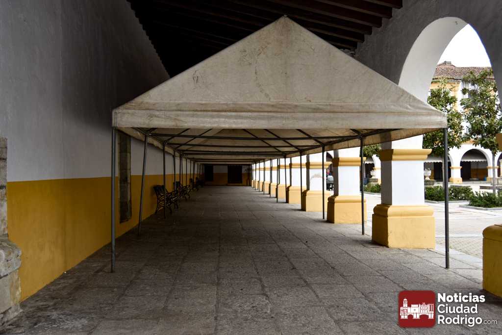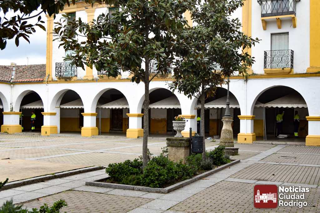 Operarios municipales situaron en los soportales de la Plaza del Buen Alcalde durante la mañana de lunes las primeras carpas que albergarán la IV edición del Mercado Artesano de Ciudad Rodrigo, un evento que ya se ha vuelto «costumbre» en estas fechas y que está impulsado por la concejalía de Ferias Culturales y Mercados Artesanales del Ayuntamiento de Ciudad Rodrigo.