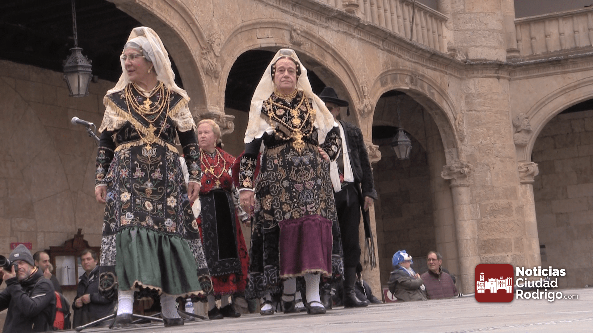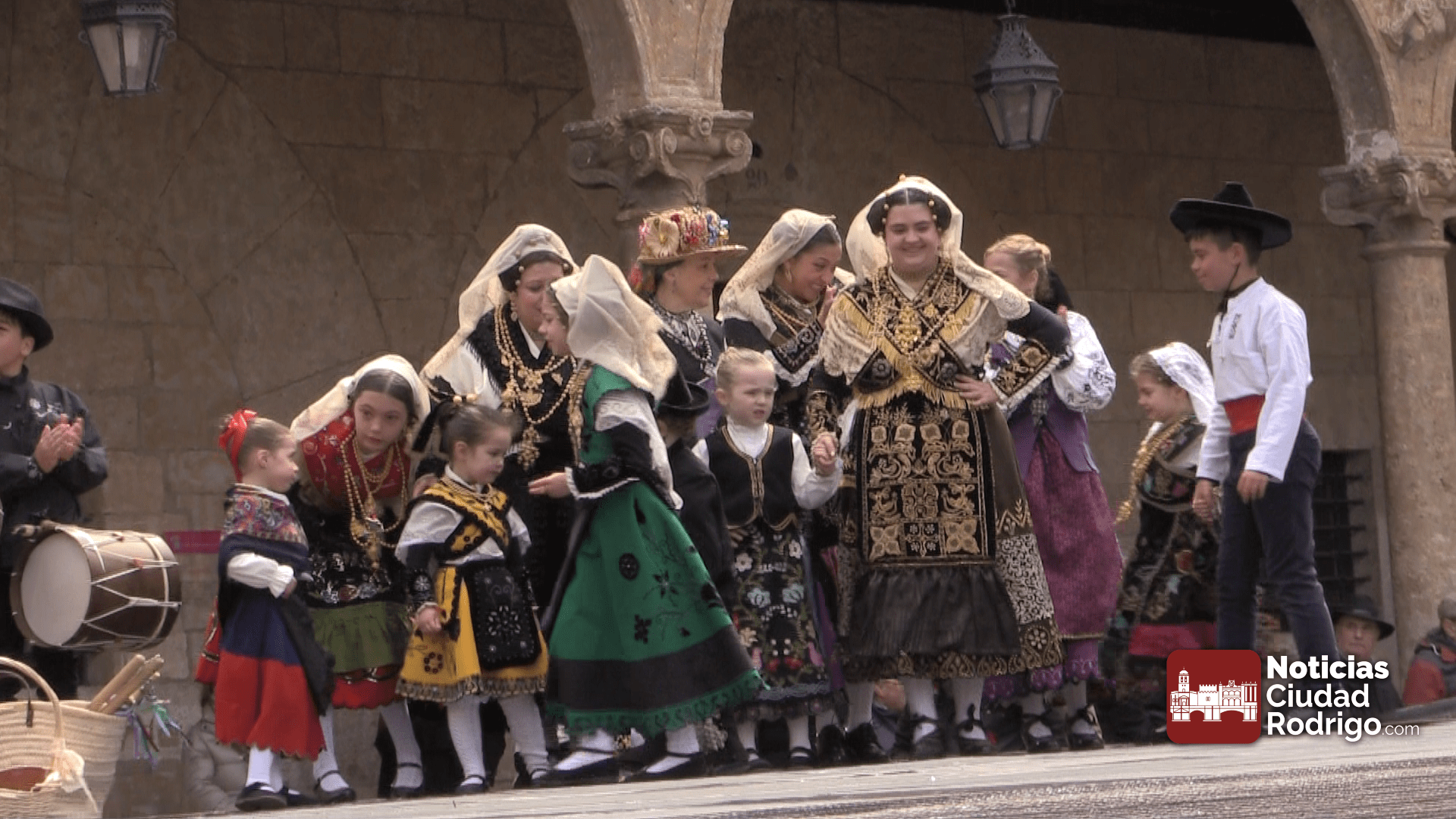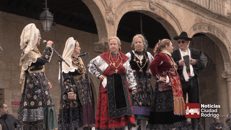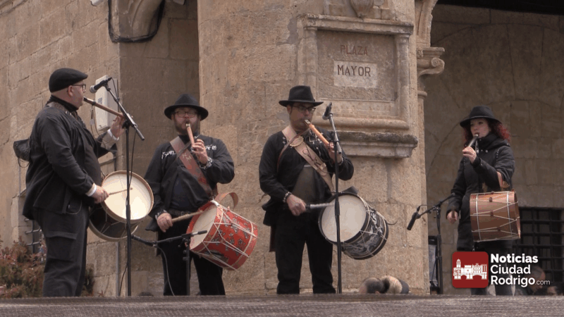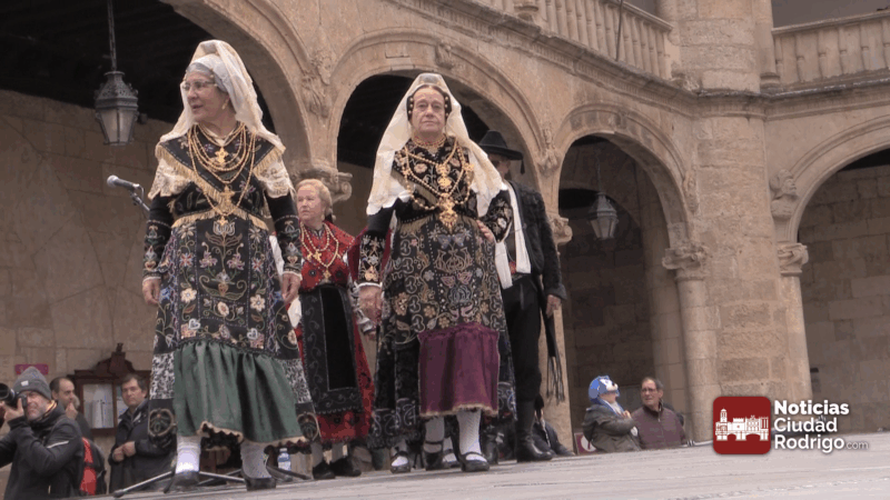 Actuación de los niños y niñas del grupo Aires Charros en la plaza Mayor de Ciudad Rodrigo, pasacalles previo de tamborileros de toda la provincia y baile y muestra de trajes del grupo Botón Charro de Miróbriga