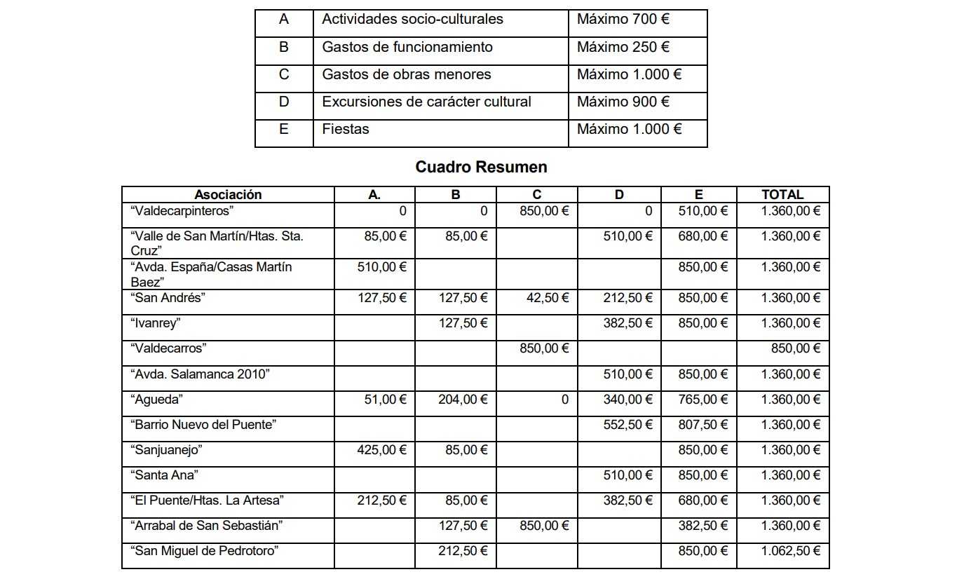 En lo referente a las Asociaciones Vecinales, se han otorgado ayudas a un total de 14 entidades de estas características, repartiéndose 18.232,50€ entre ellas (96% del total). De estas 14, ninguna ha obtenido el máximo de 1.600€/asociación, pero sí que 12 de ellas se quedan bastante cerca, obteniendo una cuantía de 1.360€, estas son Valdecarpinteros, Valle de San Martín, Av. España y Báez, San Andrés, Ivanrey, Av. Salamanca, Águeda, Barrio Nuevo, Sanjuanejo, Santa Ana, El Puente y Arrabal de San Sebastián. Por otro lado, Valdecarros obtiene 850€ y Pedrotoro 1.062.50€.