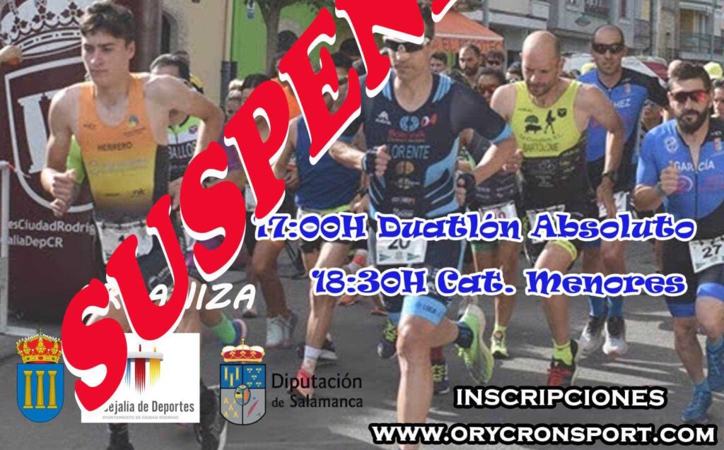 El Ayuntamiento de Ciudad Rodrigo ha anunciado, de acuerdo con la empresa encargada del cronometraje, la suspensión del VI Duatlón Cross de Ciudad Rodrigo previsto para este próximo sábado, día 10 de mayo. El motivo de esta suspensión se debe a la falta de inscritos para la prueba (tan solo habían formalizado su participación 8 adultos y 10 niños).
