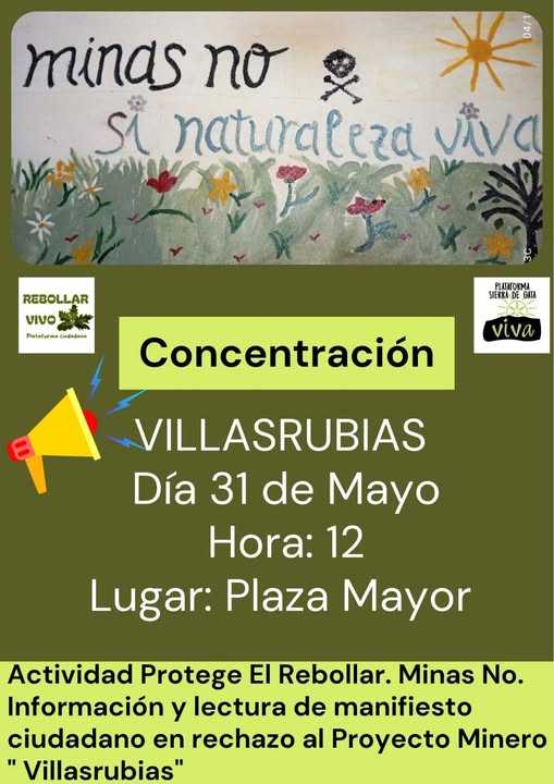 Rebollar Vivo y Sierra de Gata Viva han organizado para el próximo sábado 31 de mayo en Villasrubias una concentración contraria al proyecto minero «Villasrubias». Será en la plaza Mayor a las doce, información y lectura de un manifiesto ciudadano en rechazo a las minas en el Rebollar.