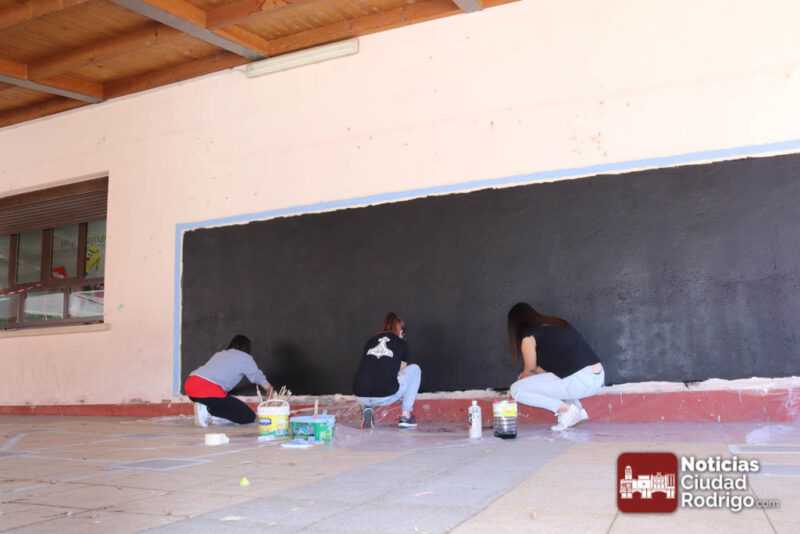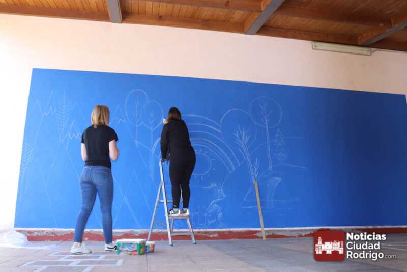 Madres del AMPA del colegio San Francisco se encuentran en este momento preparando dos nuevos murales en el patio del centro. En esta ocasión, uno de los murales es una pizarra donde los niños y niñas podrán dibujar con tiza y otro es el paisaje de fondo con montañas para la incorporación futura de los elementos de un pequeño rocódromo.