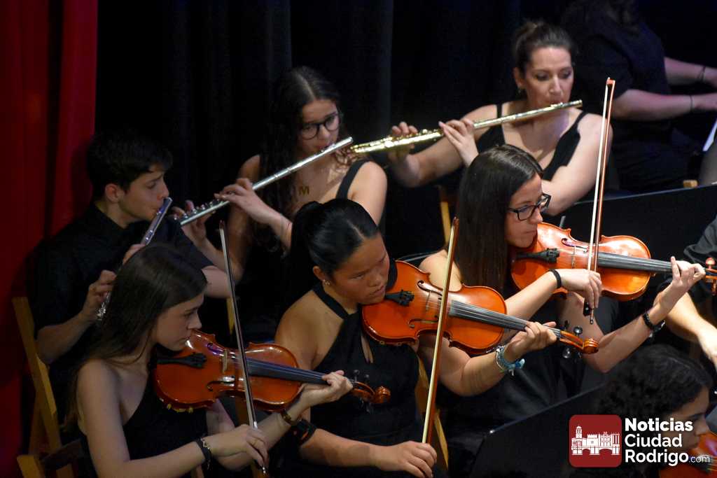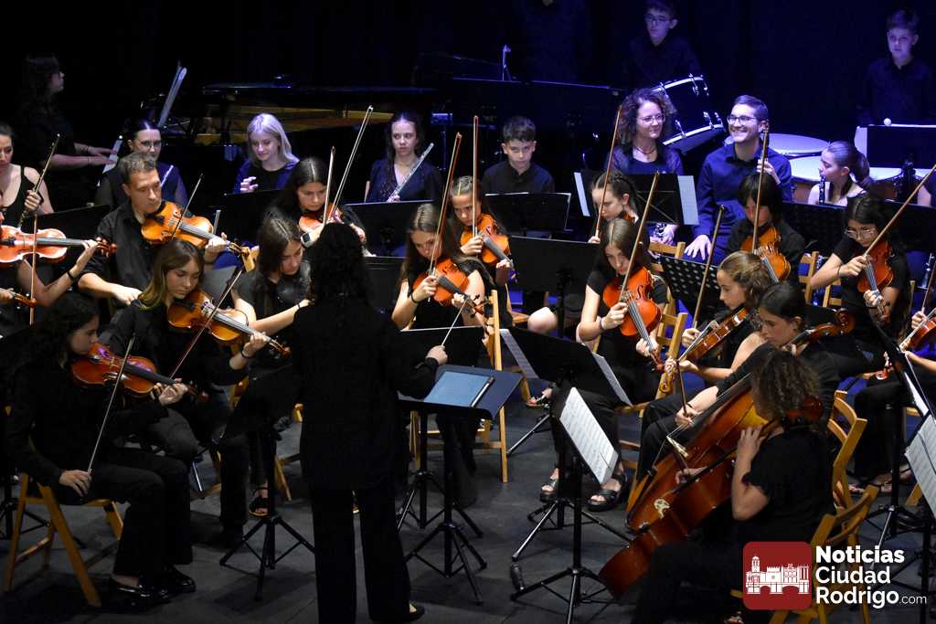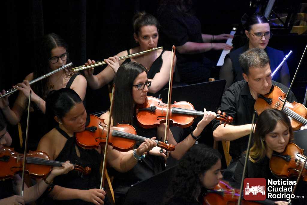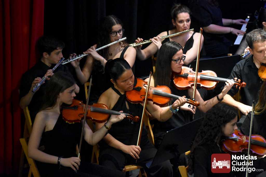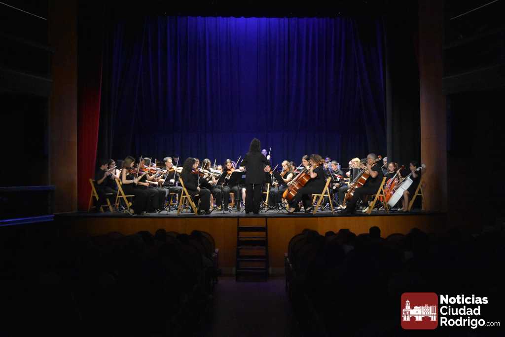 La Orquesta Sinfónica de Ciudad Rodrigo, perteneciente a la Escuela Municipal de Música «Juan Esquivel de Barahona», cerró el curso 2025/26 con un brillante concierto de música clásica y cinematográfica en el Teatro Nuevo «Fernando Arrabal». El ágora cultural mirobrigense presentó tres cuartos de entrada para una cuidada interpretación musical dirigida por Raquel Romero Toro.