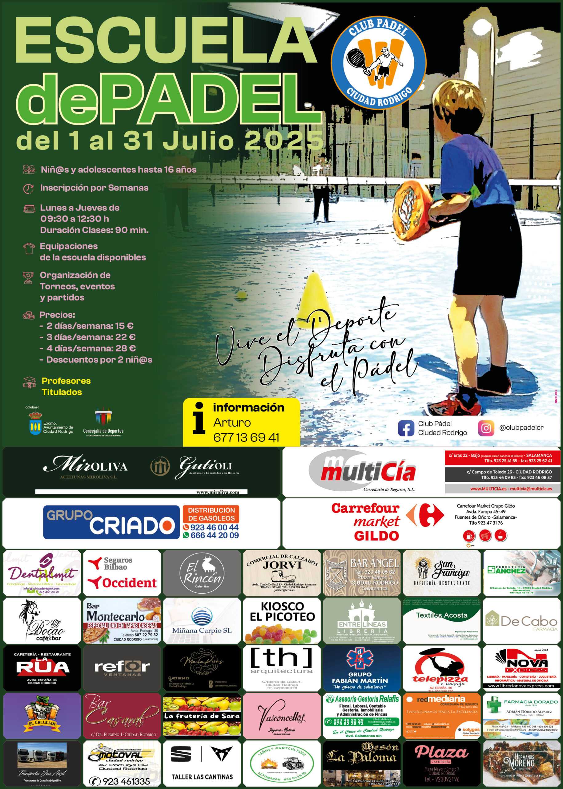 El Club de Pádel de Ciudad Rodrigo, junto con la Concejalía de Deportes del Ayuntamiento de Ciudad Rodrigo en calidad de entidad colaboradora, presentó durante esta mañana la primera edición de su Escuela de Pádel de Verano, una iniciativa que se desarrollará del 1 al 31 de julio en las pistas de pádel mirobrigenses y que está dirigida a niños y adolescentes hasta 16 años.