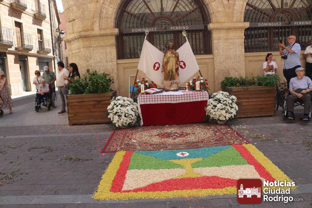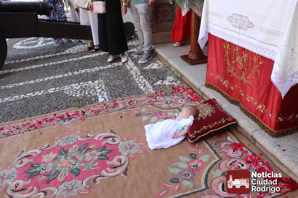 Después de la celebración litúrgica, ha tenido lugar la procesión por las calles de la localidad. La carroza era llevada por miembros de la cofradía del Silencio que este año, como novedad, se han encargado de preparar uno de los altares previstos: ubicado en la calle San Juan. Los otros dos estaban, como es habitual, en la puerta de la capilla de Cerralbo, iglesia parroquial de El Sagrario, y a la puerta de la Casa Consistorial, donde había un bebé de pocos meses en la alfombra, que ha sido bendecido por el obispo.