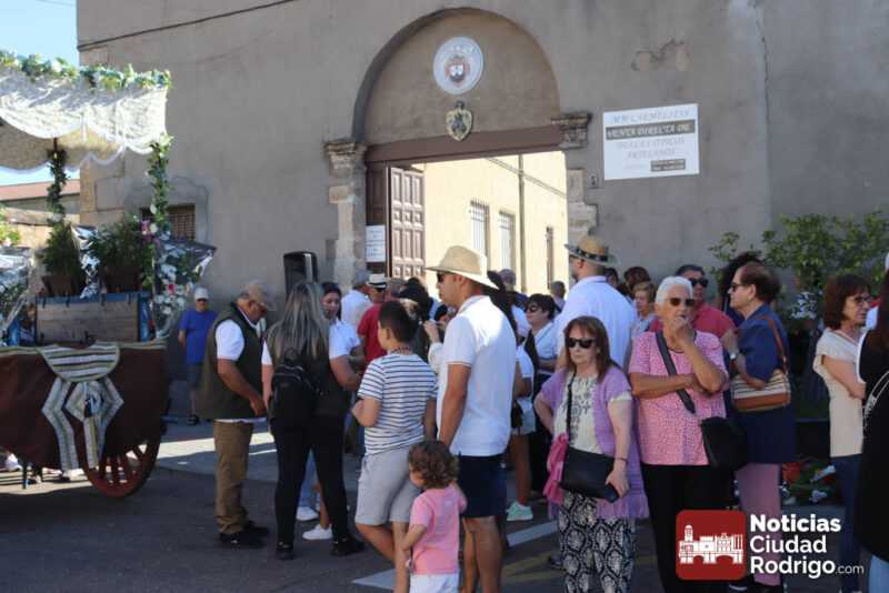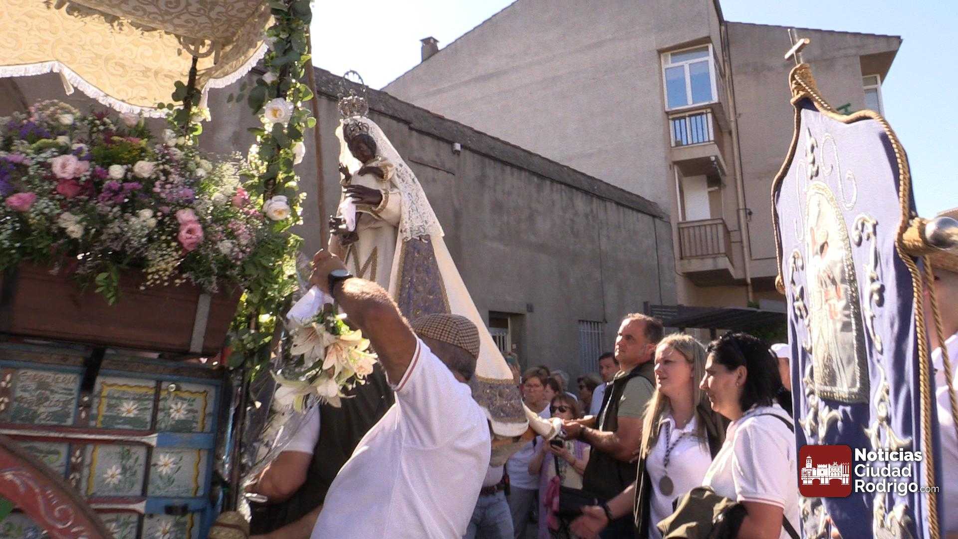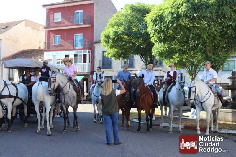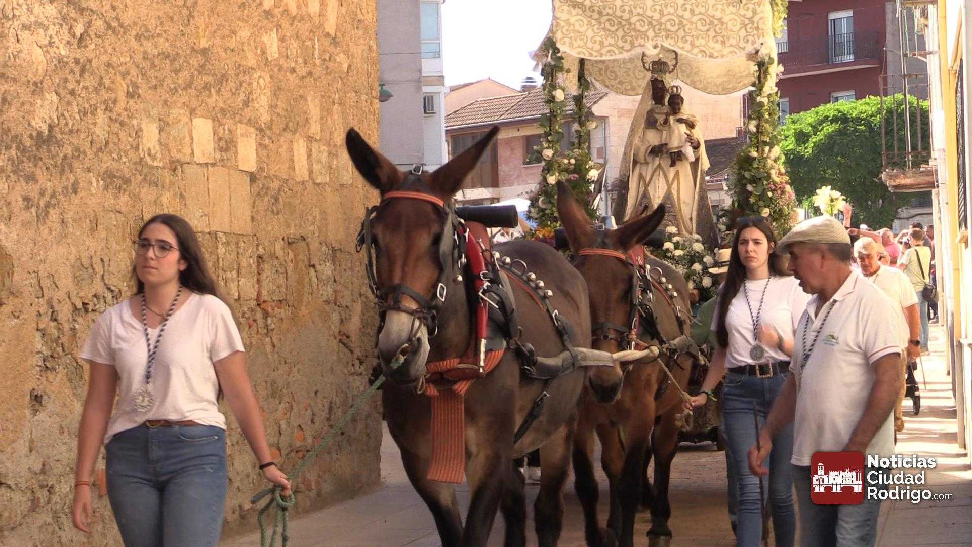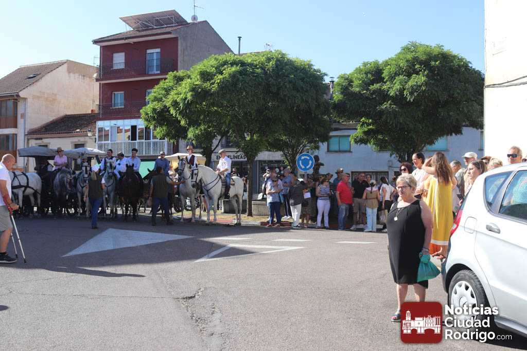 La participación en la Romería al Santuario de la Peña de Francia que parte de Ciudad Rodrigo sigue batiendo récord. Mucha gente a pie, numerosas carretas y decenas de caballos acompañando el carruaje de la Virgen en el punto de partida, el Monasterio de las Madres Carmelitas, al que acudió numeroso público para ver la salida.
