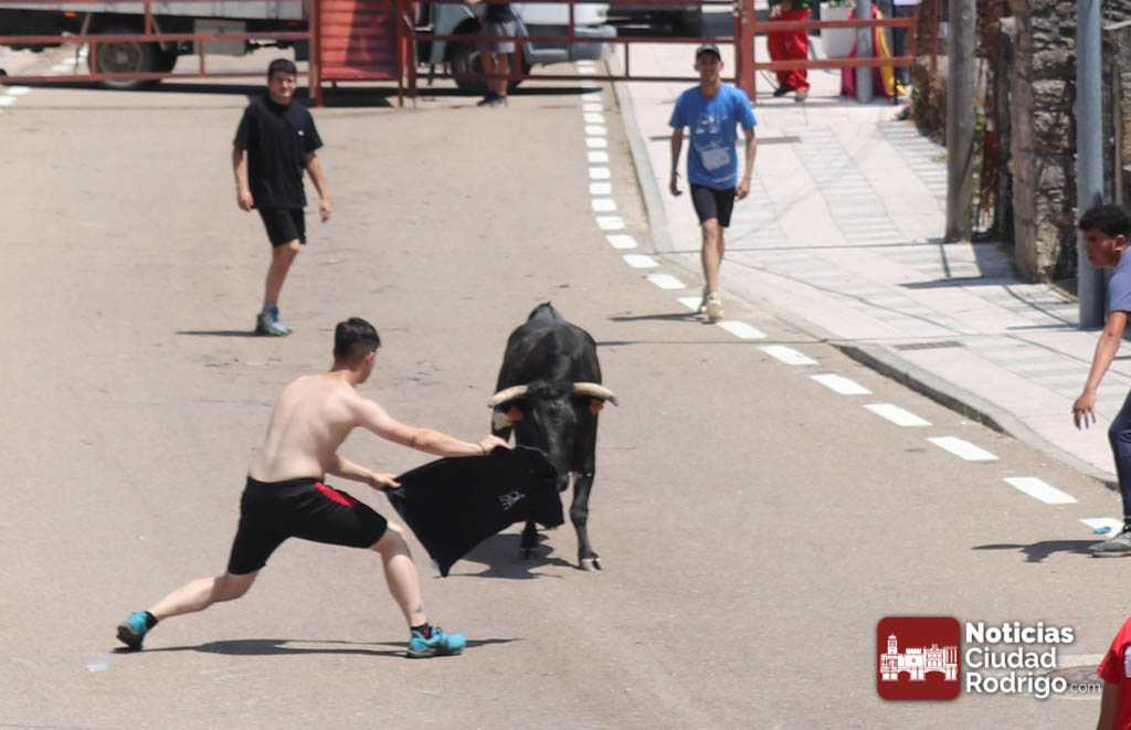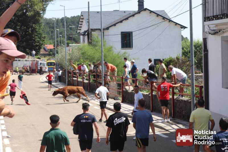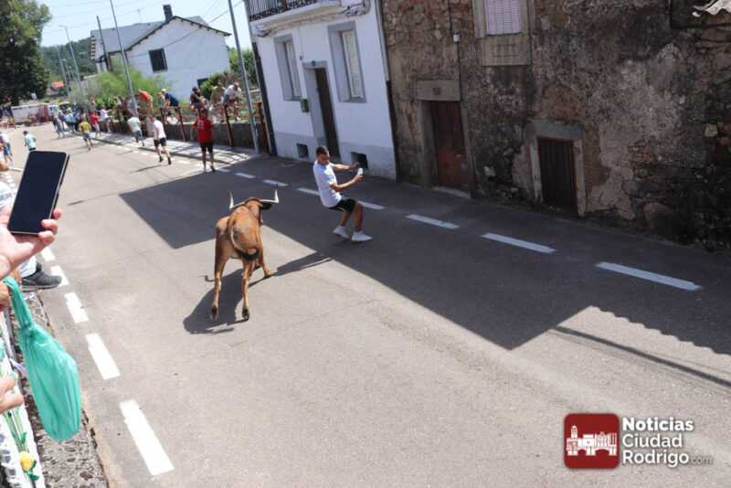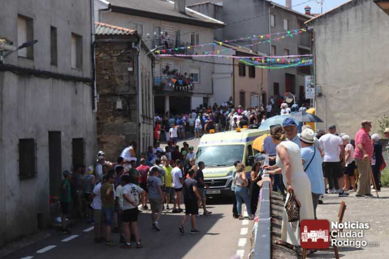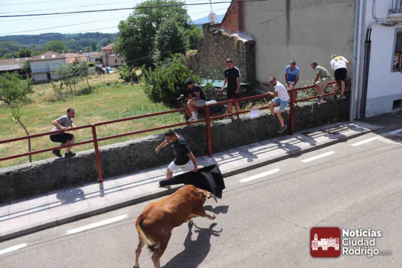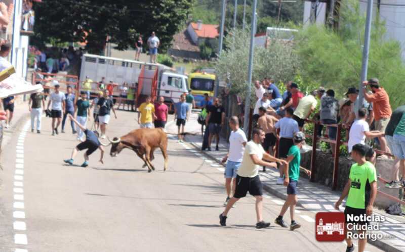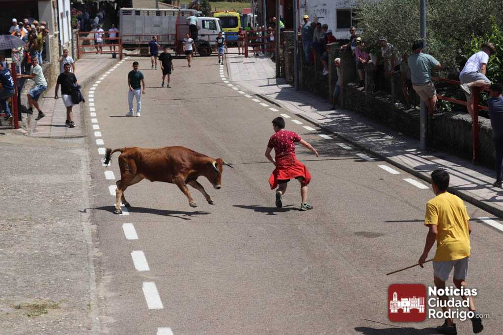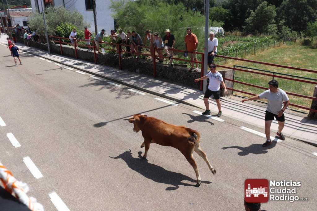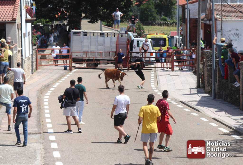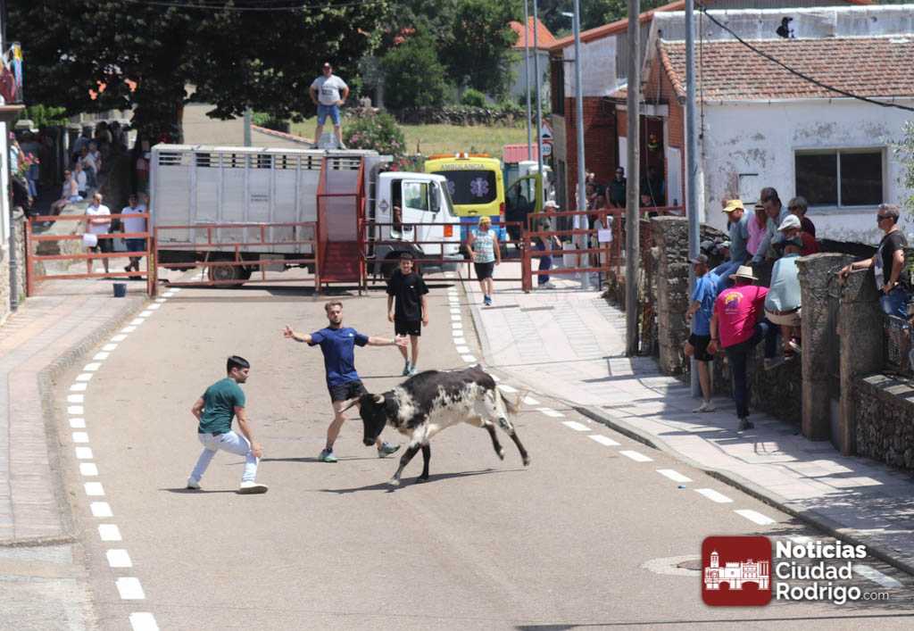 Navasfrías ha vivido una emocionante y vibrante Vaca de Cajón en esta calurosa mañana de domingo 29 de junio. Antes ha tenido lugar un encierro infantil con minibueyes que han sido muy bien acogidos por los niños y niñas participantes. Y después ha habido suelta de vaquillas, con un susto por parte de una de ellas que decidió colarse en una cochera, sorprendiendo a las personas que estaban dentro. Además, una señora tuvo que ser atendida por ambulancia debido a un mareo. Por lo demás, todo transcurrió con normalidad, hubo participación y mucha animación. La última tarde de las fiestas de San Juan ha estado dedicada a los niños.