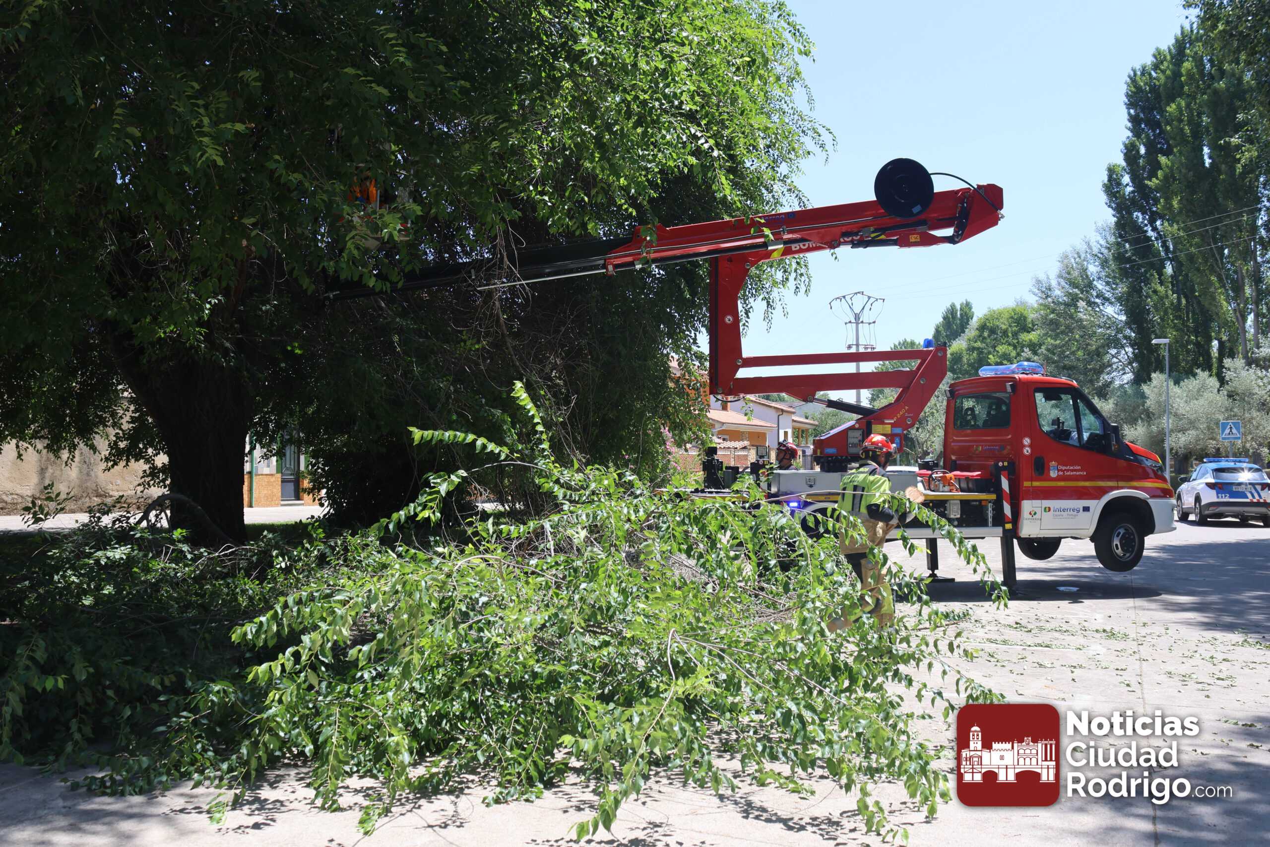 Los Bomberos de la Diputación de Salamanca del parque de Ciudad Rodrigo han tenido que intervenir esta mañana en un árbol en la calle Regato Cachón, en el Arrabal del Puente de Ciudad Rodrigo. En el lugar, también estuvo presente la Policía Local de Ciudad Rodrigo, regulando el tráfico y apoyando la seguridad de la actuación. Los bomberos fueron avisados de la situación por el Ayuntamiento de Ciudad Rodrigo.