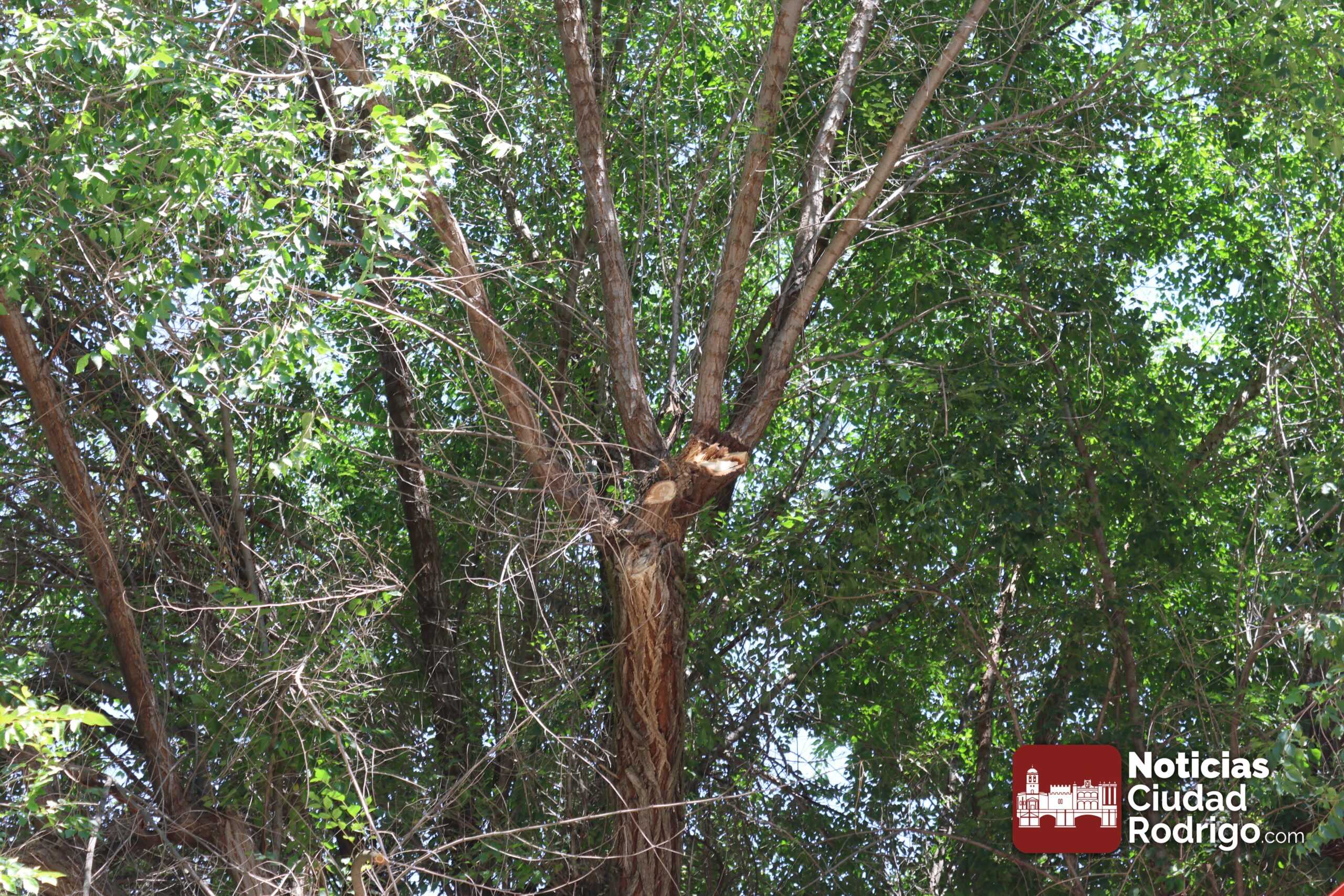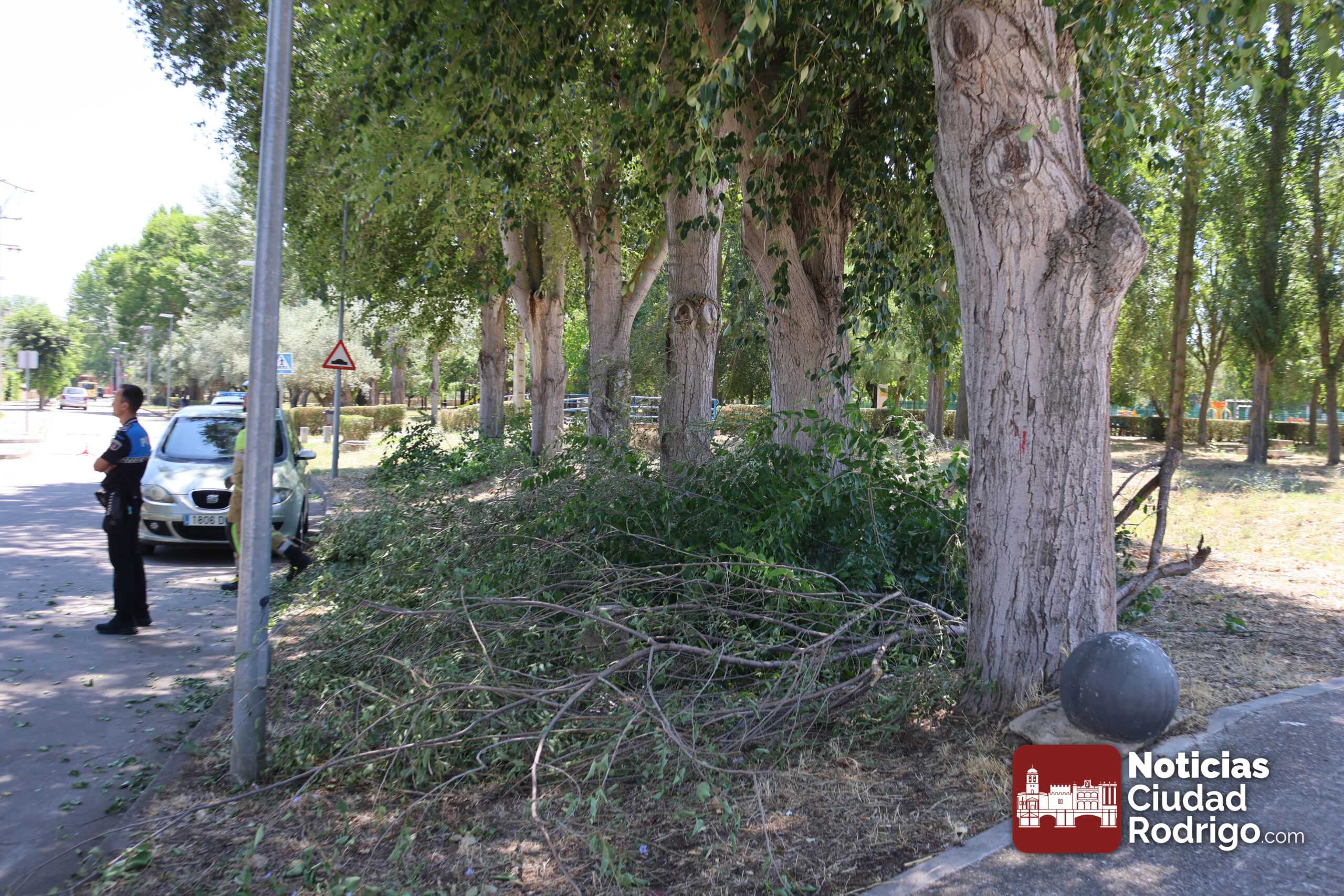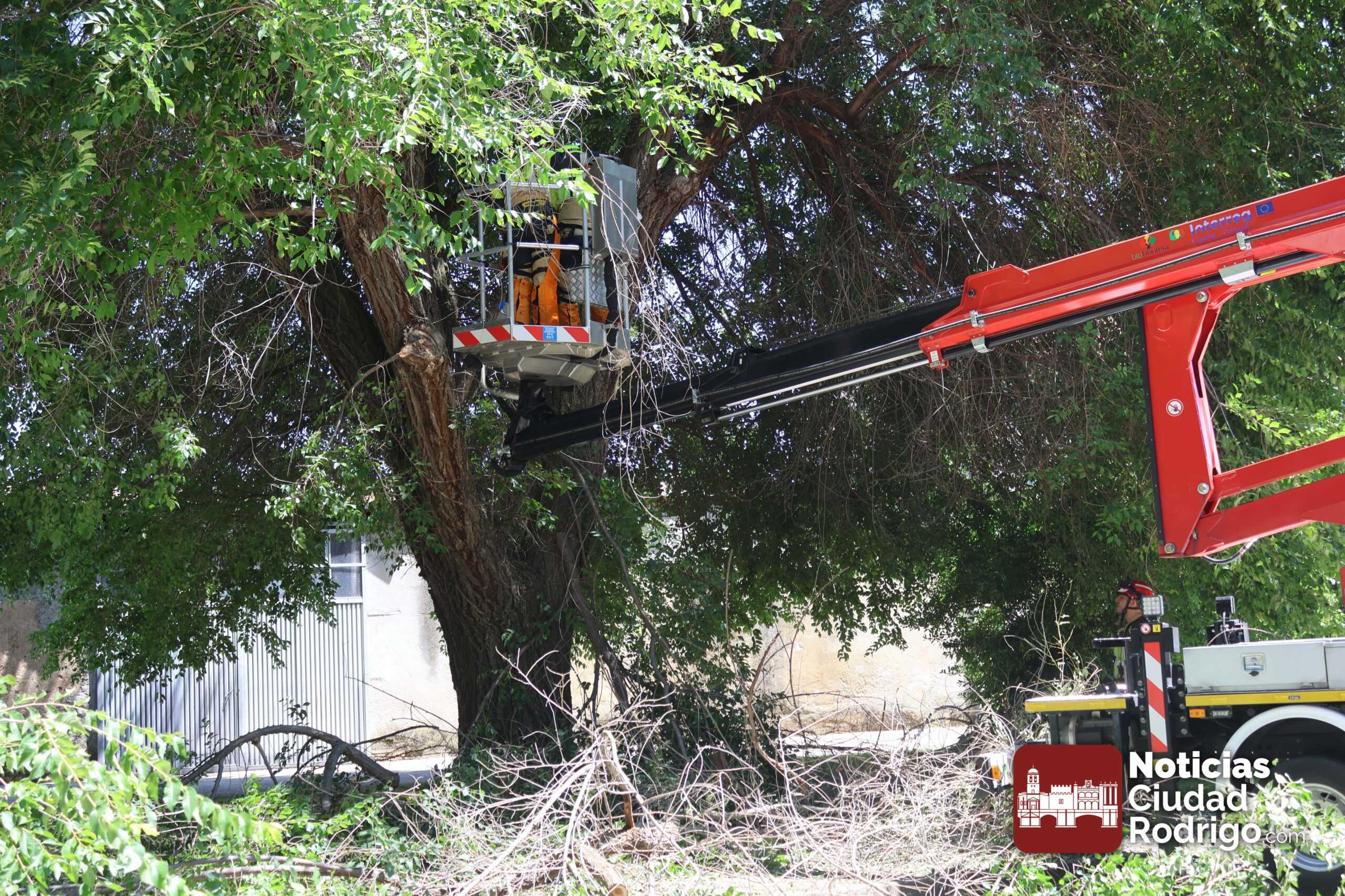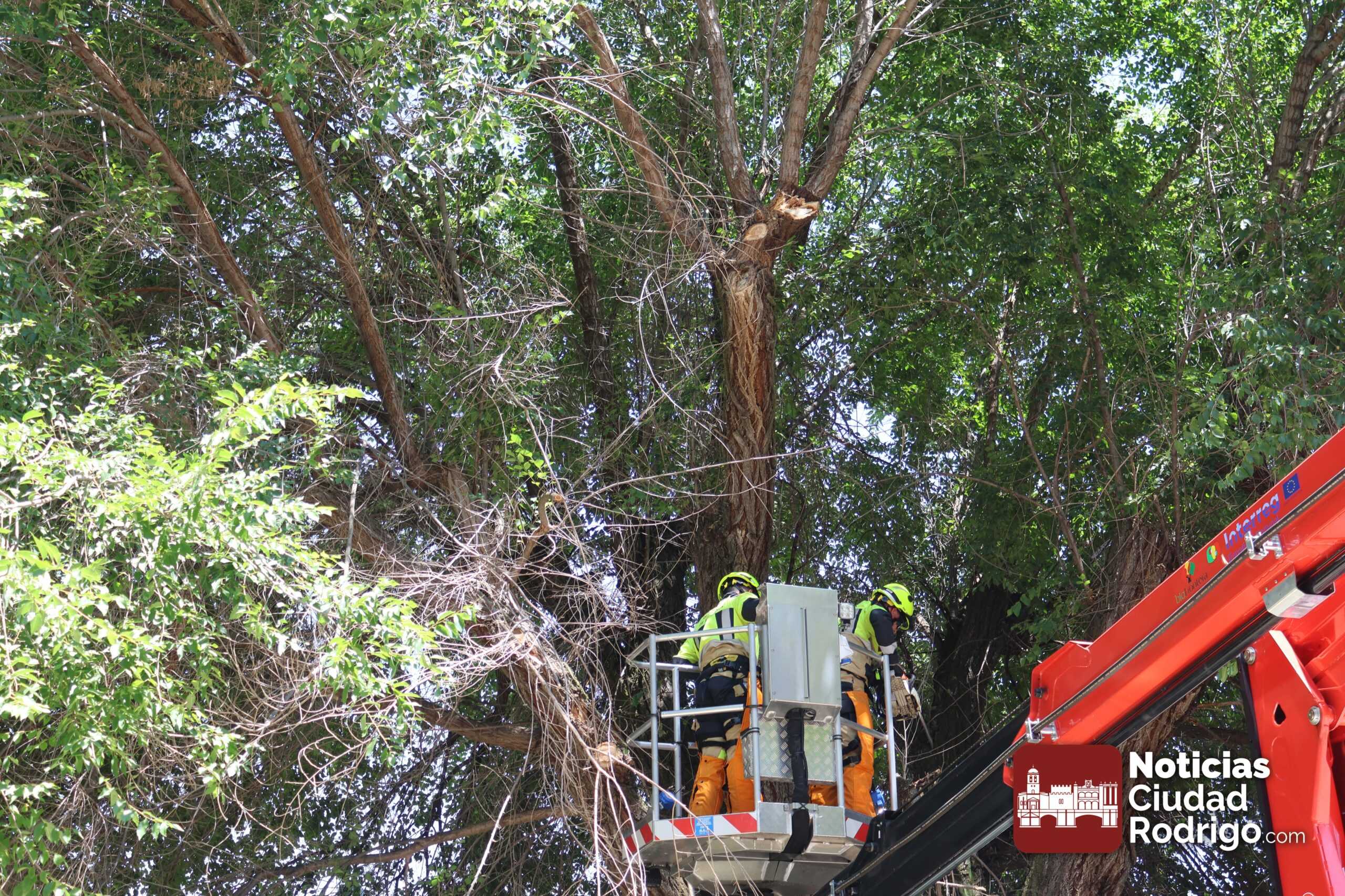 El árbol tenía desprendidas algunas ramas en la parte superior que corrían el peligro de caer en cualquier momento. En el lugar, también estuvo presente la Policía Local de Ciudad Rodrigo, regulando el tráfico y apoyando la seguridad de la actuación.