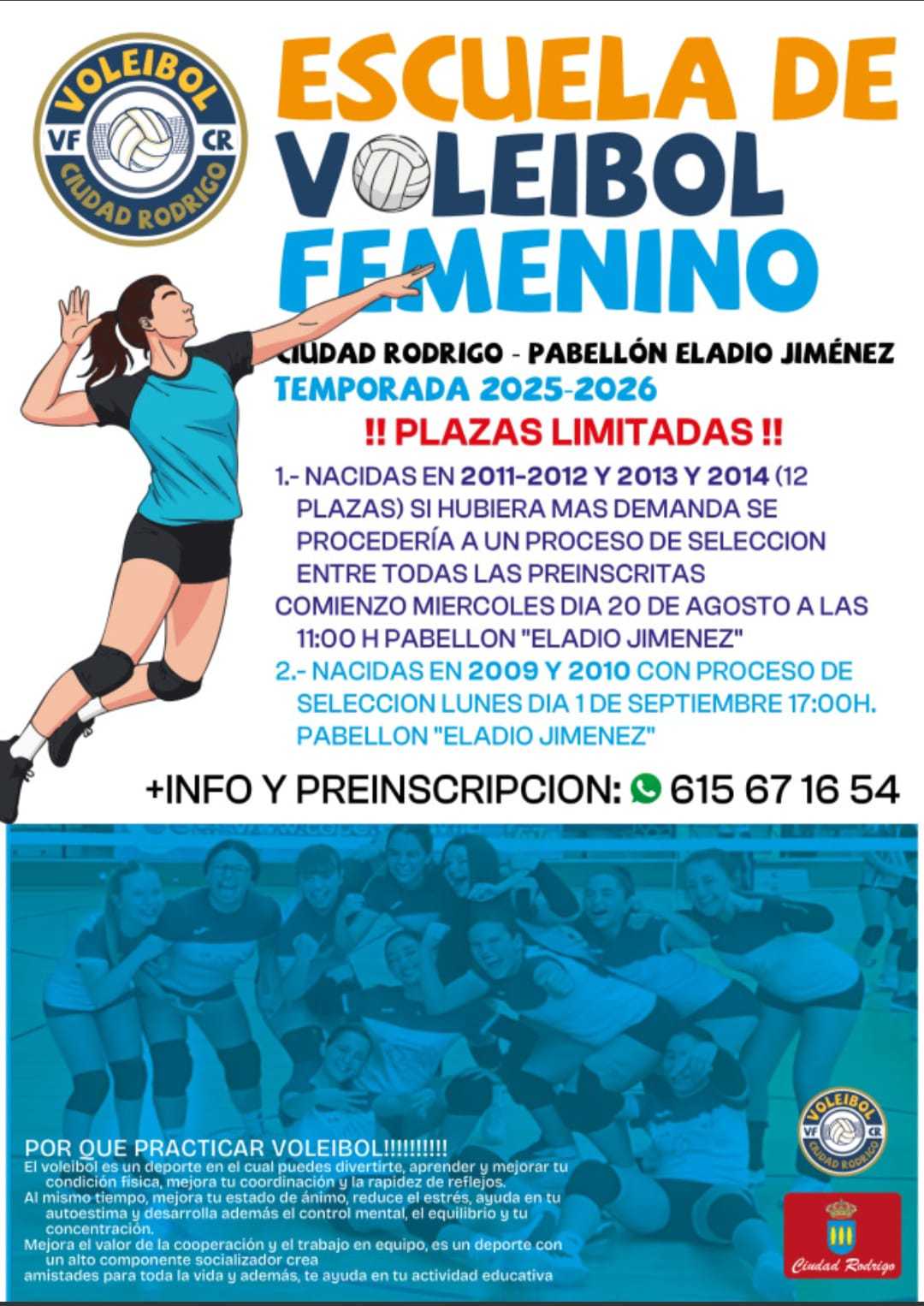 La Escuela de Voleibol Femenino de Ciudad Rodrigo ha abierto un periodo de inscripción. Podrán pre inscribirse nacidas entre los años 2011 y 2014. Si las preinsripciones superan las 12 plazas disponibles, se llevará a cabo un proceso de selección.