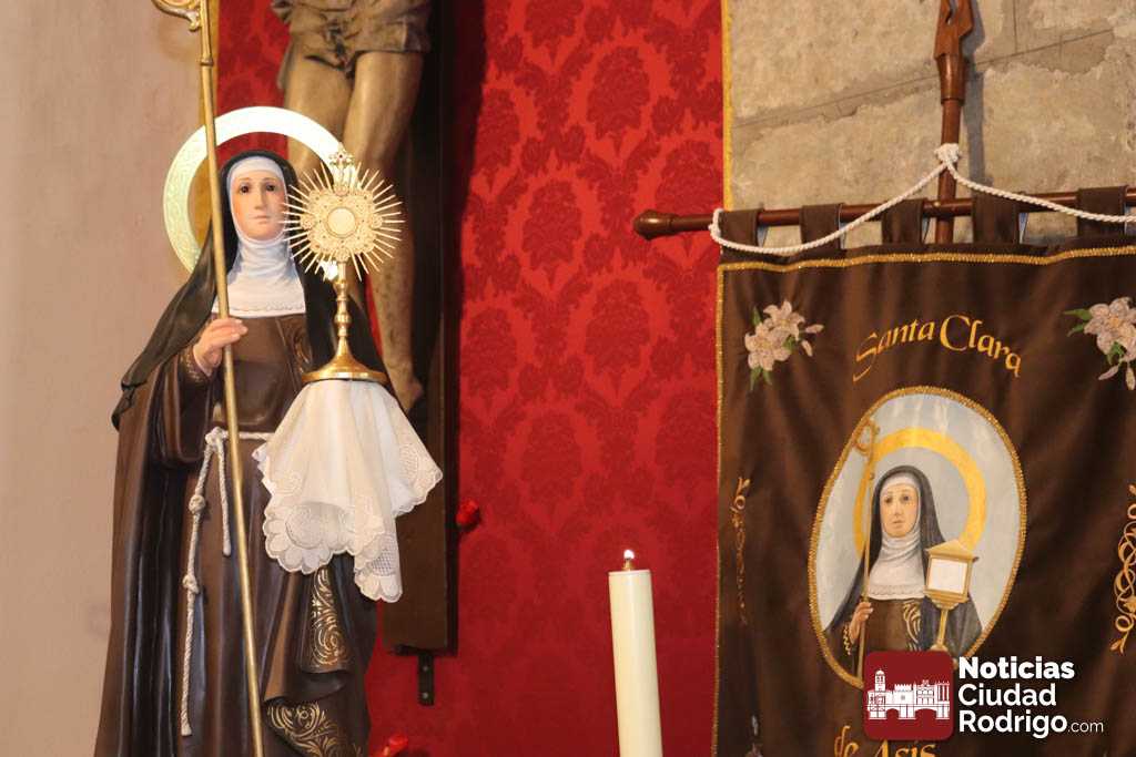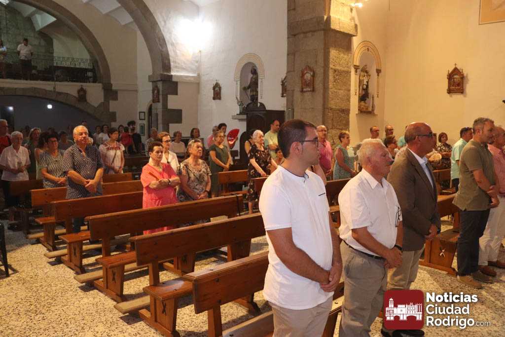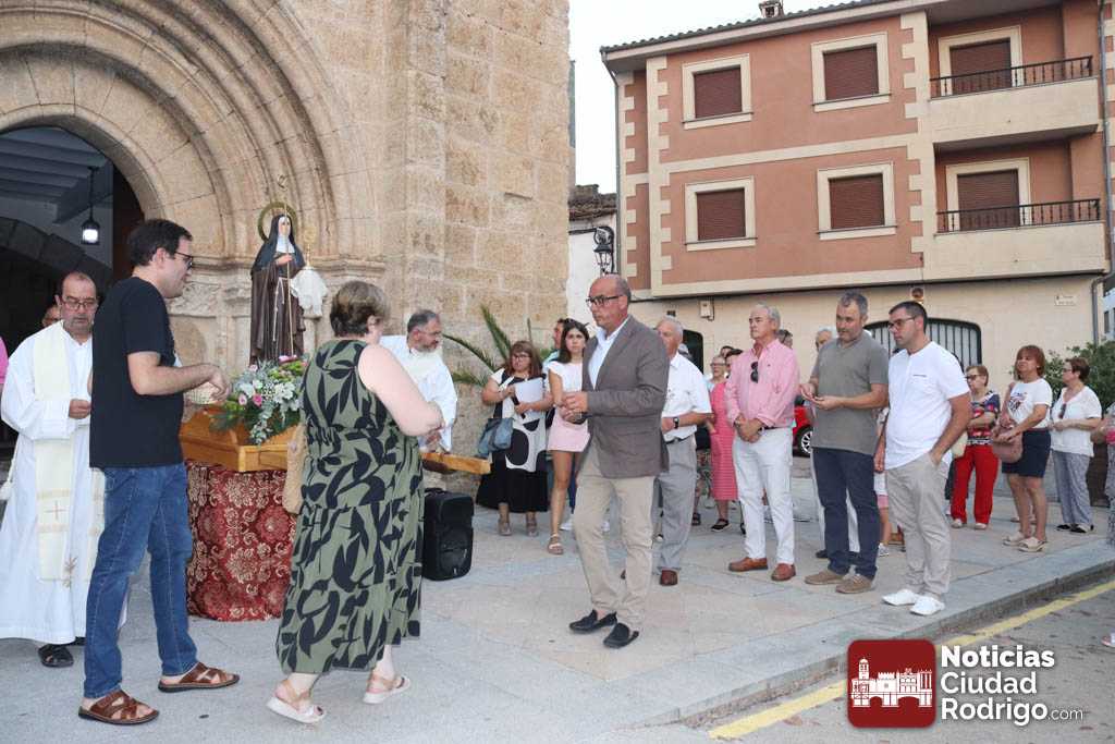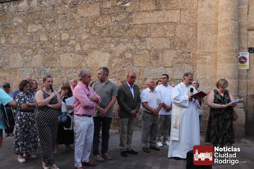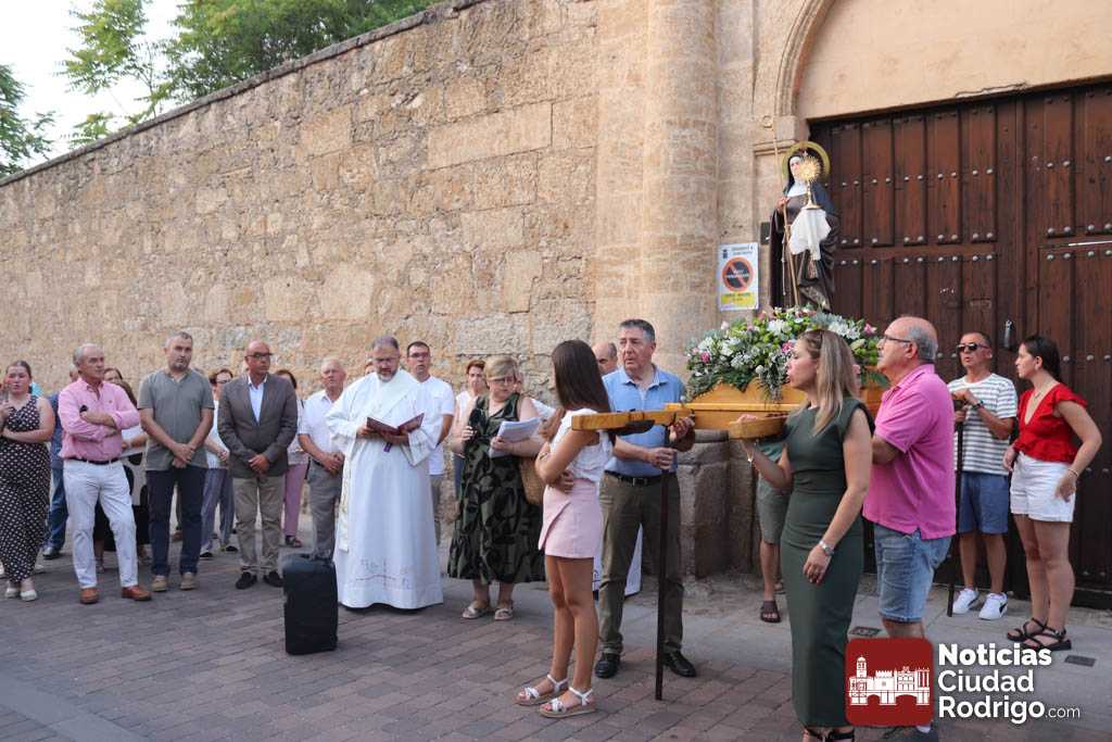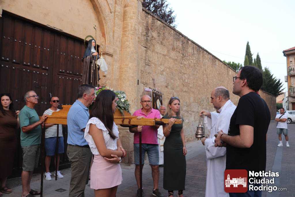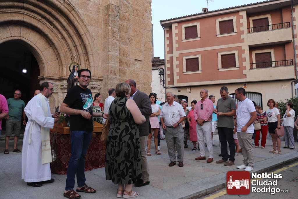 En la organización de los actos también ha participado la asociación vecinal. Todo ha comenzado con una misa, a las ocho de la tarde, concelebrada por los sacerdotes Víctor Sevillano, Rafael Caño, Joaquín Pino y el diácono Daniel Mielgo, que ha predicado en la homilía. Después de la celebración litúrgica, ha tenido lugar la procesión desde el templo parroquial de San Andrés al convento de Santa Clara, donde ha tenido lugar una oración. Este convento, precisamente, se encuentra vacío y, entre las peticiones, se ha rogado por la vuelta de las Madres Clarisas a este convento abierto en Ciudad Rodrigo desde el siglo XIII.