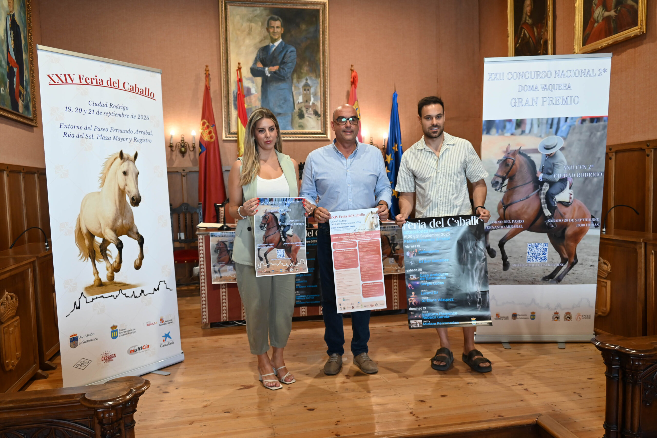 La XXIV Feria del Caballo de Ciudad Rodrigo tendrá lugar del 19 al 21 de septiembre en Ciudad Rodrigo. La programación y actuaciones musicales incluidas en el programa, ha tenido lugar esta mañana en el salón de plenos del ayuntamiento mirobrigense y ha sido realizada por el teniente de alcalde, Ramón Sastre; la delegada de Ferias Ganaderas, Joana Veloso, y el edil de Festejos, Víctor Gómez.