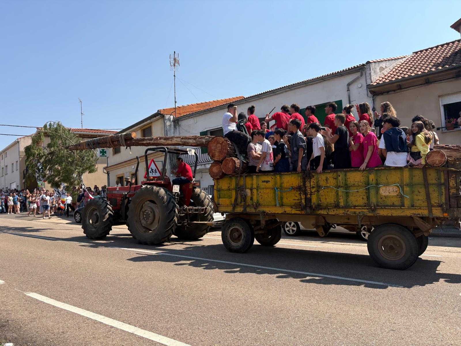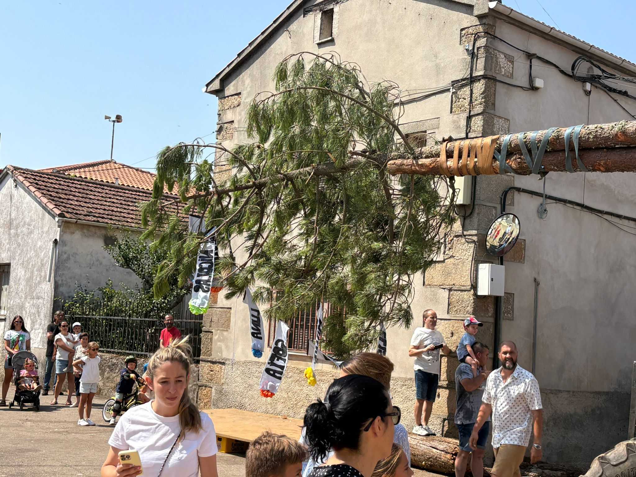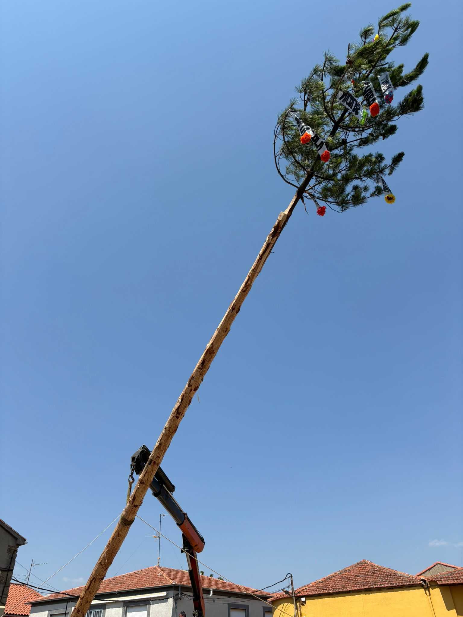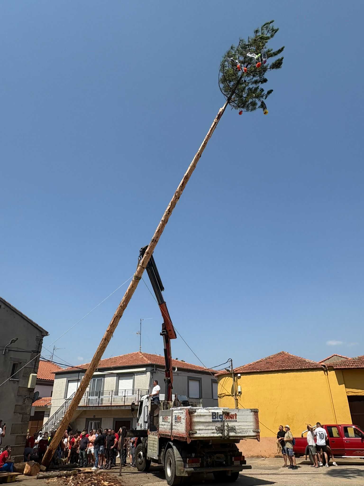 Desde primera hora de la mañana se han ido cumpliendo los pasos de la tradición, desde ir a buscar el pino, almorzar en el monte y regresar para ponerlo en el pueblo, donde se ha izado a la una de la tarde.