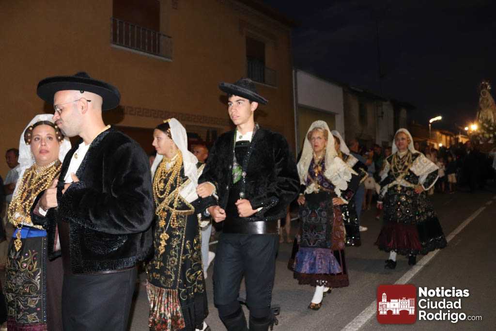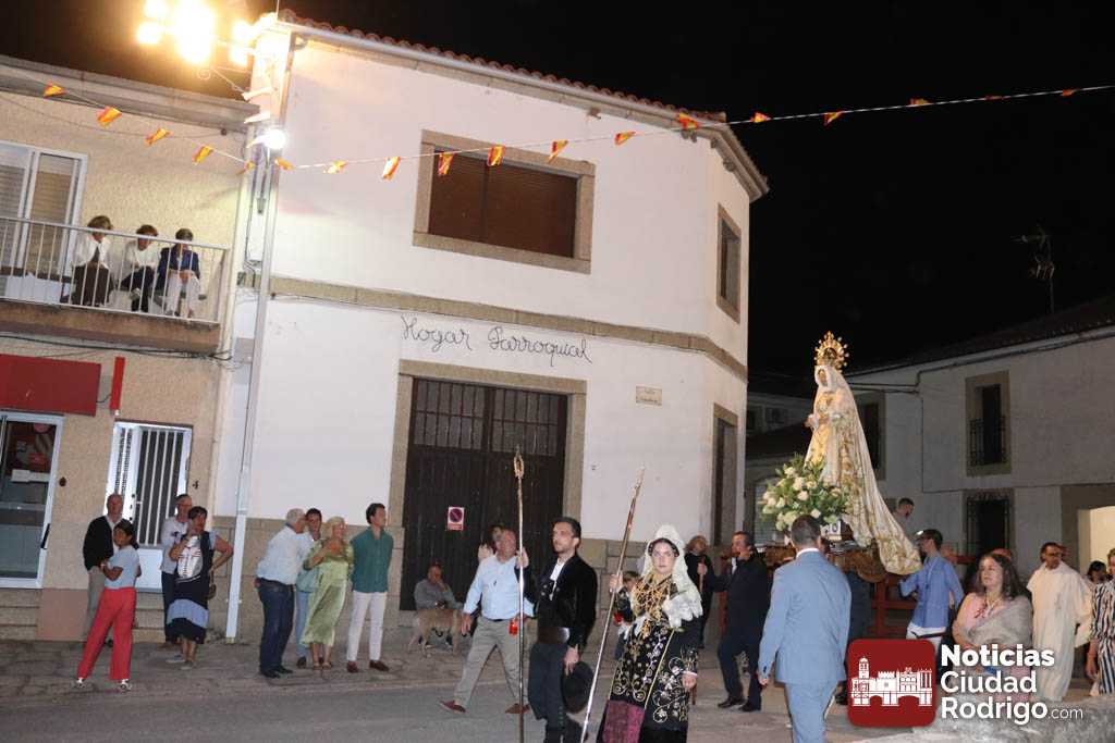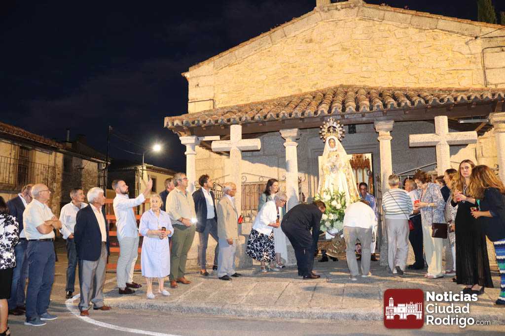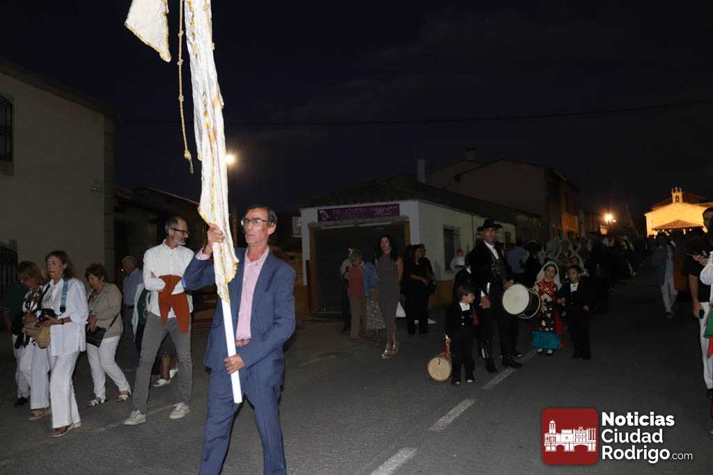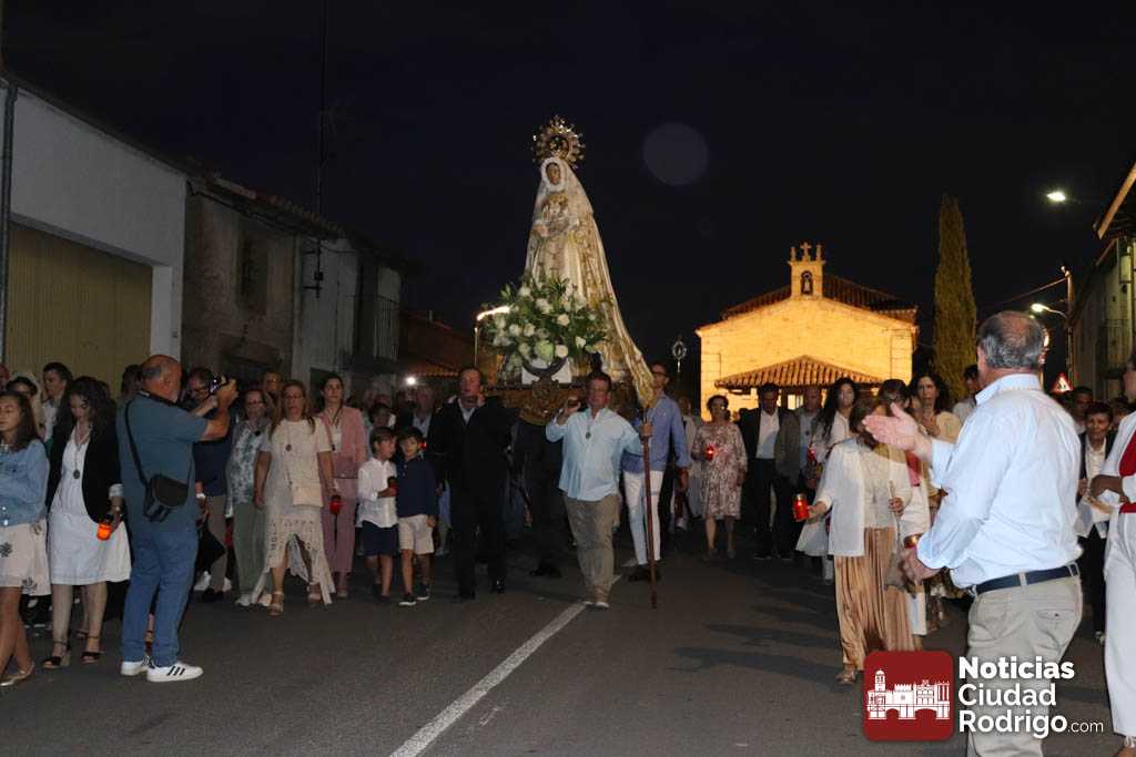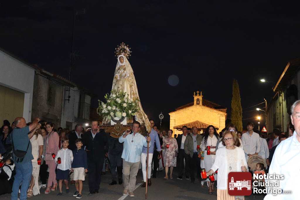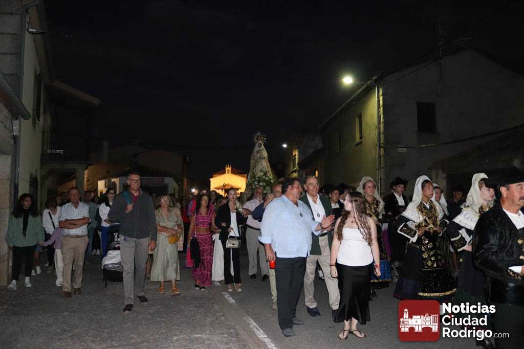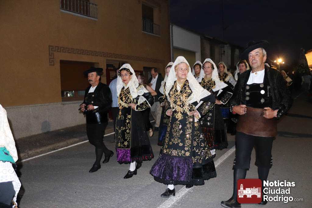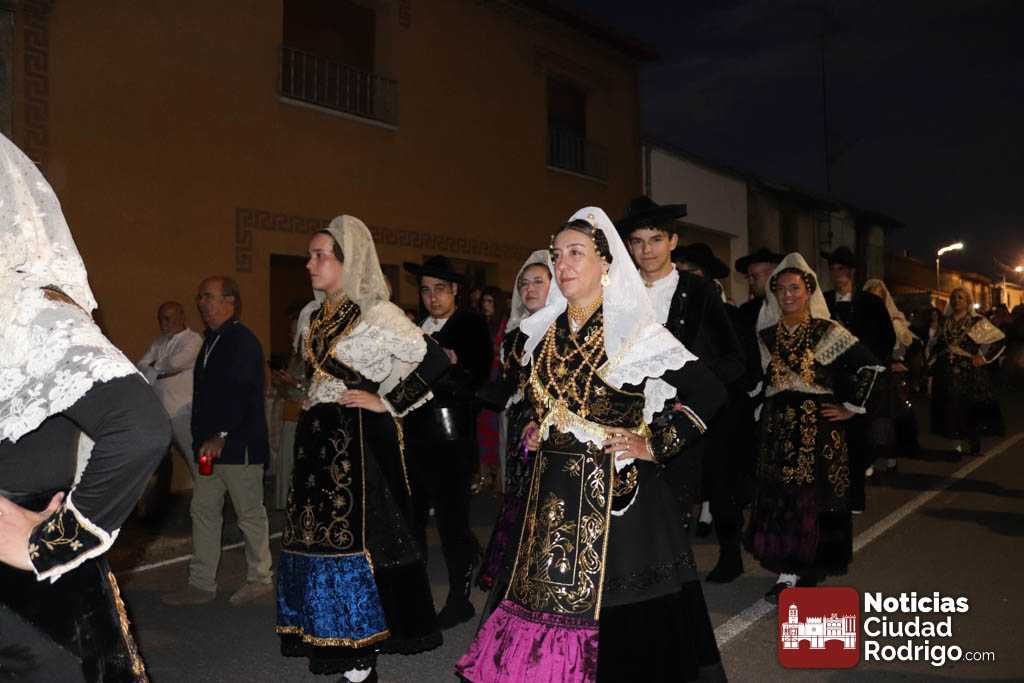 A las nueve de la noche, comienza la novena en la ermita y el Santo Rosario. Los mayordomos, Eva y Javier, acompañados por el sacerdote párroco Jesús Gutiérrez han llegado antes hasta el lugar acompañados de charros y charras de todas las edades al ritmo de la gaita y el tamboril. Al término del rezo, comienza el traslado. El grupo de charros delante, decenas de personas con velas y la Virgen en andas realizando el trayecto procesional hasta la plaza Mayor.
